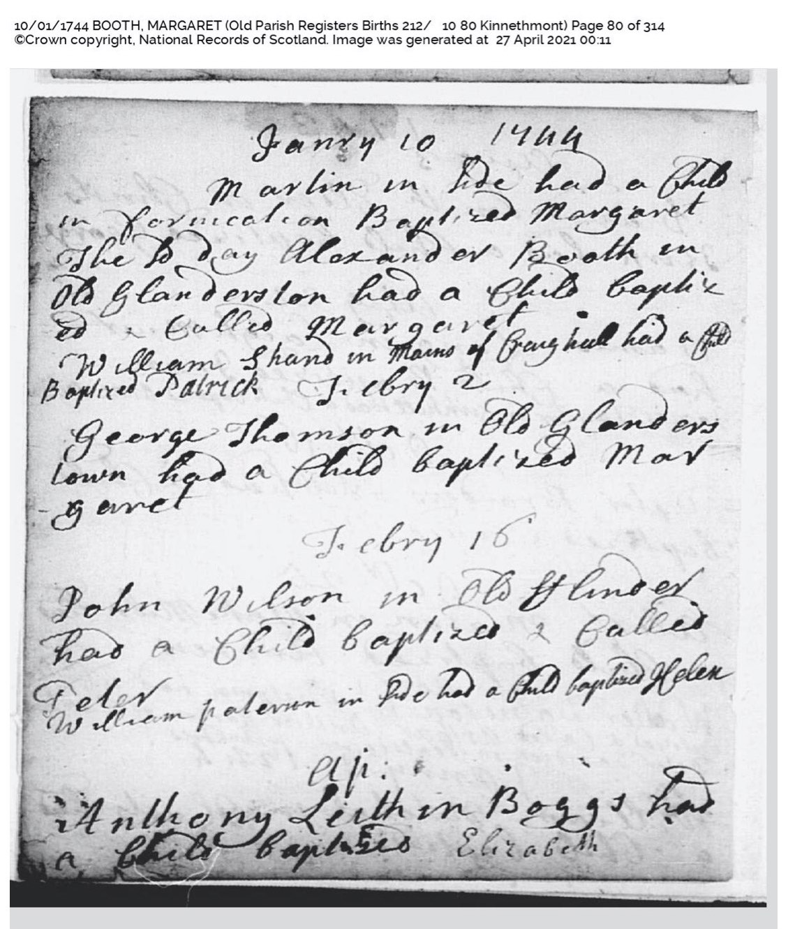| | Media object | Booth Baptisms of Leslie Parish 1789-1805Format: image/png Image dimensions: 633 × 394 pixels File size: 56 KB Type: Document Highlighted image: no Note: It is unlikely that James Booth of Drumgowan had more than one wife. No marriage records have been found to date. According to the Leslie Parish records, James of Drumgowan and his wife Isabel had a daughter Isabel in 1792 but the same James of Drumgowan and his wife 'Margaret' had a child named William in 1794. However the death record of young William Booth 85 years later in Forbes confirms that his mother's name was Isabel Booth.