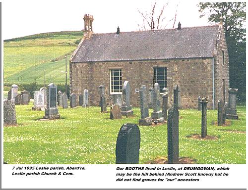 | Isabel BOOTHBirth: August 6, 1792 44 29 — Drumgowan, Leslie Parish, Aberdeenshire, Scotland Death: May 21, 1843 — Methlick, Aberdenshire, Scotland | William BOOTHBirth: July 4, 1794 46 31 — Drumgowan, Leslie, Aerdeen Death: August 29, 1879 — Silver Stone, Tullynessle & Forbes Parish, Aberdeenshire, Scotland | Margaret BOOTHBirth: May 26, 1796 48 33 — Drumgowan, Leslie, Aerdeen Death: December 31, 1874 — Dufftown, Banffshire, Scotland | Elizabeth BOOTHBirth: February 21, 1798 50 35 — Drumgowan, Leslie, Aerdeen Death: October 7, 1889 — Jones, Iowa, USA | James BOOTHBirth: May 1800 52 37 — Drumgowan, Leslie, Aberdeen | Jane BOOTHBirth: October 10, 1802 54 39 — Drumgowan, Leslie, Aerdeen Death: November 26, 1881 — Leslie Parish, Aberdeenshire, Scotland | George BOOTHBirth: March 19, 1807 59 44 — Drumgowan, Leslie, Aerdeen |