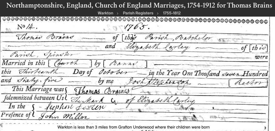 | Joseph BRAINESBaptism: April 5, 1767 — Grafton Underwood, Northhamption, England | Thomas BRAINESBirth: September 1768 — Grafton Underwood, Northhamption, England Death: June 26, 1850 — Keystone, Huntingdonshire, England | Mary BRAINESBirth: October 2, 1768 — Grafton Underwood, Northamptonshire, England | | Jane BRAINESDeath: December 1785 — Grafton Underwood, Northamptonshire, England | Ann BRAINESBaptism: February 23, 1777 — Grafton Underwood, Northhamption, England Death: October 9, 1803 — Grafton Underwood, Northhamption, England | Benjamin BRAINESBirth: One set of parish books says he was born in 1778, another states it was 1773 — October 24, 1778 — Grafton Underwood, Northamptonshire, England Death: September 17, 1803 — Grafton Underwood, Northamptonshire, England | Henry BRAINESBirth: August 2, 1779 — Grafton Underwood, Northamptonshire, England | James BRAINESBaptism: December 3, 1783 — Grafton Underwood, Northamptonshire, England Burial: February 28, 1811 — Grafton Underwood, Northamptonshire, England | William BRAINESBirth: January 15, 1781 — Grafton Underwood, Northamptonshire, England | George BRAINESBirth: December 30, 1786 — Grafton Underwood, Northamptonshire, England |