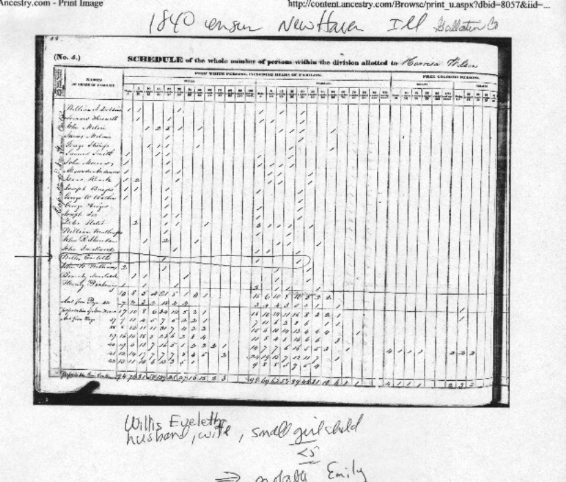 Census | 1840 (on the date of death) Note: Willis and Patsy had an infant daughter - probably Emily Eveleth.