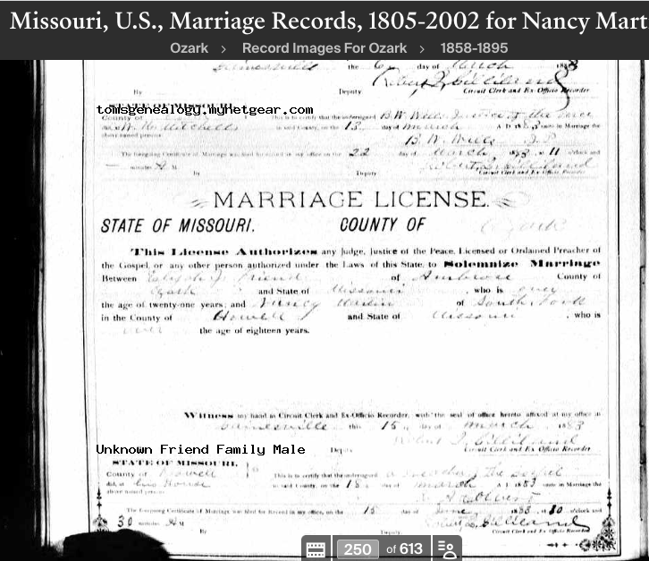 Marriage | Nancy Catherine MARTIN — View this family March 15, 1883 (Age 49 years) Note: The marriage license was from Ozark Co but the actual marriage was in Howell County 3 days later.