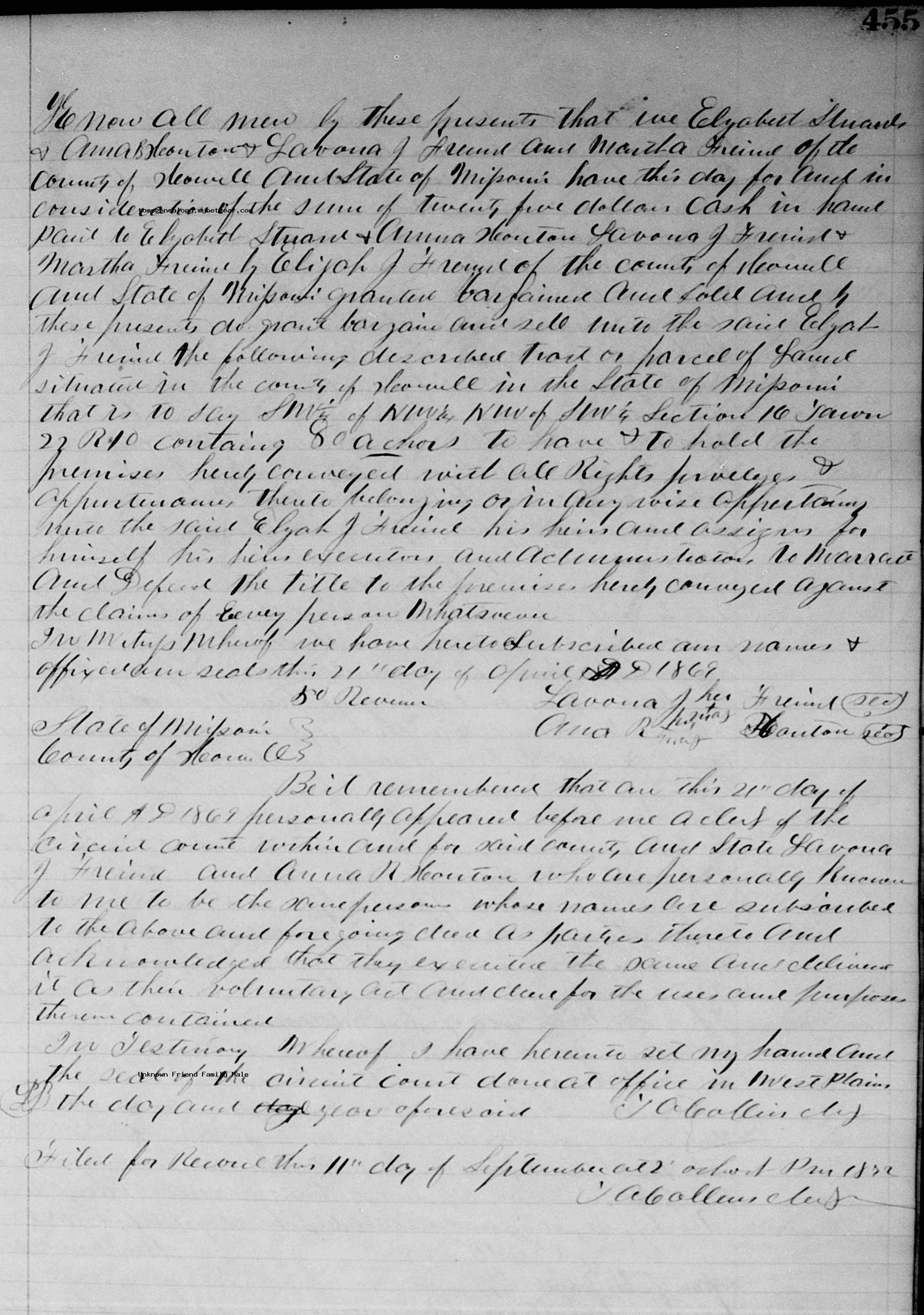 Property | Farm in Howell County MO between 1869 and 1883 (Age 35 years)Note: After his father Alexander died Elijah bought out his siblings and bought other parcels to end up with 540 acres which he sold on March 2,1883 to Mr William S Wright of Ozark County. Elijah declared himself to be a single man in the documents and two weeks later he married Ms Nancy Martin.