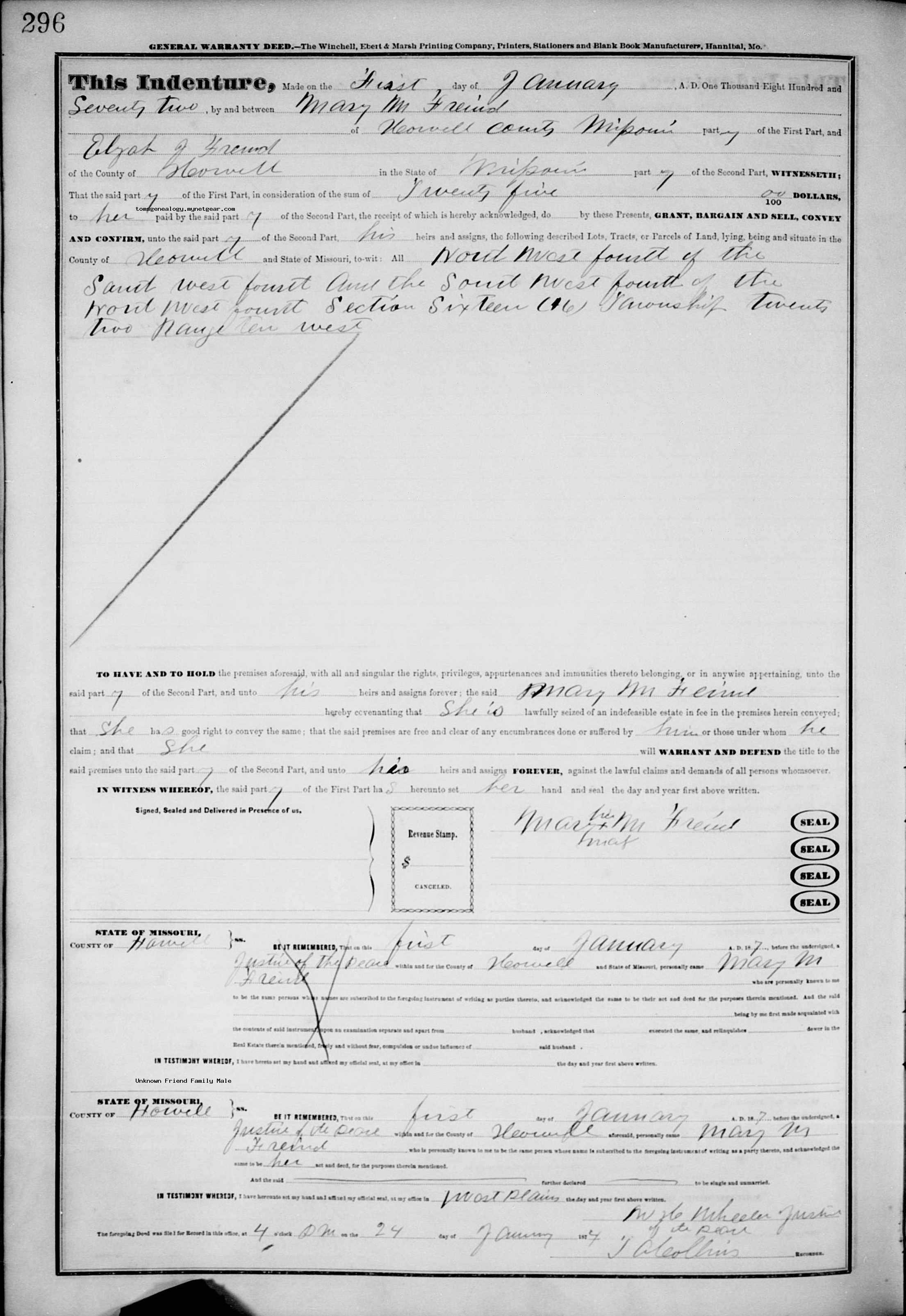 | Federal Appointment | Elijah J Friend in Appointments of U. S. Postmasters, 1832-1971 Name Elijah J Friend Post Office Location Yankee Doodle, Howell, Missouri Appointment Date 14 May 1873 to 13 Nov 1776 Volume Number 36 Volume Year Range 1867-1878 |