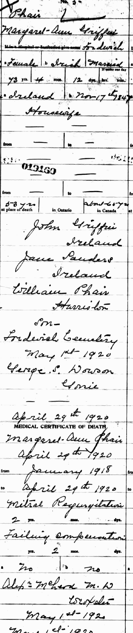 Margaret Jane GRIFFIN Birth: November 17, 1846 30 25 Death: April 29, 1920 — Fordwich, Huron County Ontario |