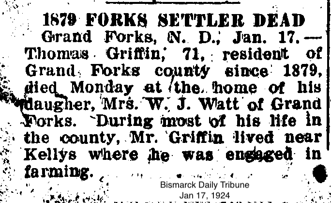 Death of a brother | Thomas GRIFFIN January 13, 1924 (Age 57 years) Shared note: From Grand Forks Newspaper: |