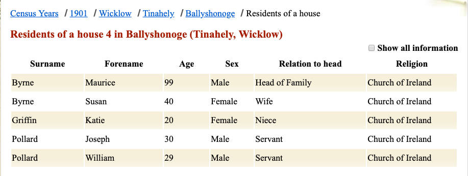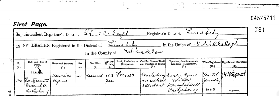 Maurice BYRNE Death: December 27, 1905 — Ballyshonoge, Tinahely, Wicklow, Ireland |