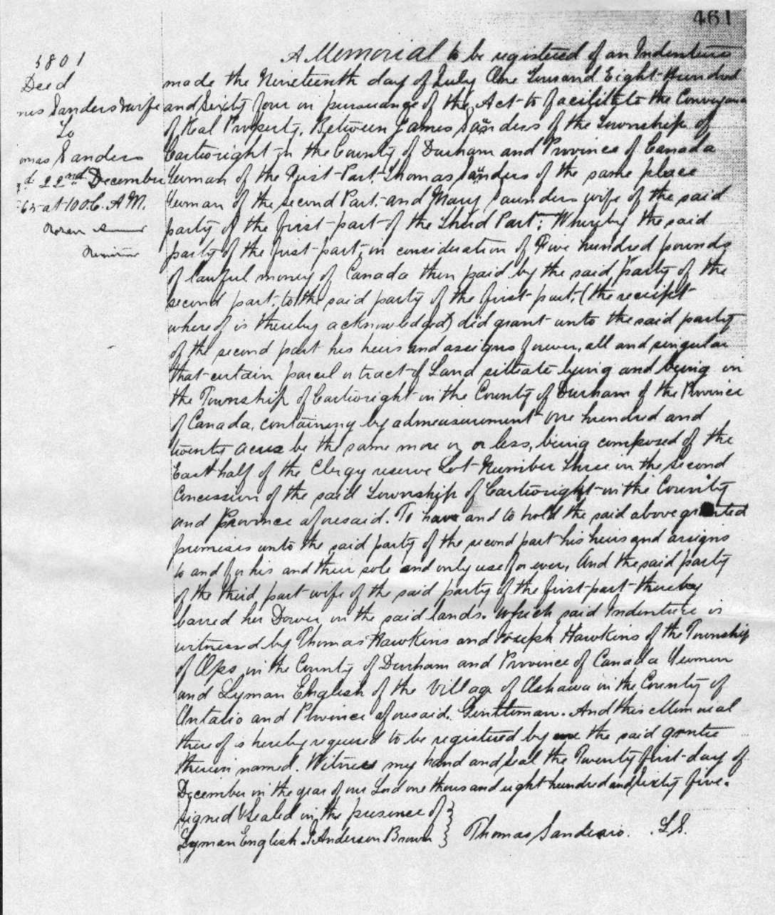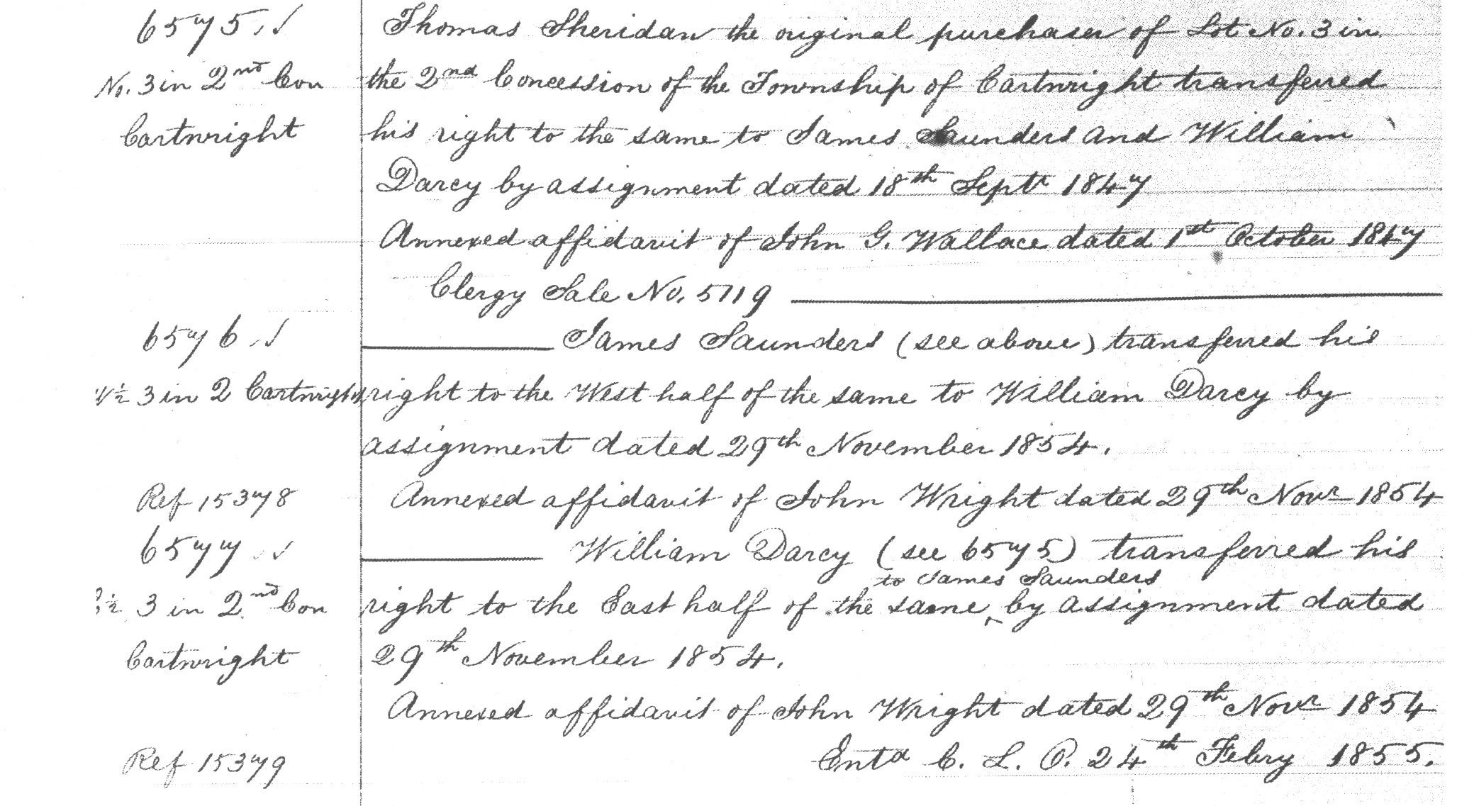 | Shared note | This description of James Saunder's land was taken from page 8 of a report prepared for the Ontario Ministry of Tourism and Culture, Nov 1, 2011. SCARLETT JANUSAS ARCHAEOLOGICAL AND HERITAGE CONSULTING AND EDUCATION 269 Cameron Lake Road Tobermory, Ontario N0H 2R0 William Darcy and his wife, the former Ann Dockerill, came to Cartwright from Knocknaboley, County Wicklow, Ireland in the mid-1840s with their four children, namely Thomas, Mary, Jane and Elizabeth. Accompanying them was the James Saunders family who had been their friends and neighbors in Ireland. The two families settled first in Whitby Township and, in 1847, found their way to Cartwright. On October 1, 1847, William Darcy and James Saunders purchased the whole 200 acres (~81 ha) of lot 3 in the second concession of Cartwright from Thomas Sheridan, an absentee owner of the land who also lived in WhitbY Township. Sheridan appears to have never received a patent for the land, nor did he occupy it. Saunders took over the east half of the lot while Darcy located his family on the west half, being a part of the current study area. On November 29, 1854, William Darcy paid James Saunders £100 and signed a deed for the west 100 acres (~40 ha). Neither deed was ever registered on title but can be found in the land index records at the Archives of Ontario. To secure their title, both men applied for crown patents for their respective acreages with William Darcy receiving a patent for the west 100 acres (~40 ha) of lot 3 on March 7, 1855. Lot 3, Concession 2 Initially, lot 3 was Clergy Reserve land, having been designated so on April 16, 1795. Clergy Reserves were tracts of land in Upper Canada reserved for the support of the Protestant clergy by the Constitution of 1791. Chaired by the Anglican Bishop of Quebec, The Clergy Corporation managed the reserves. The Constitution directed that 1/7 of all Crown lands be reserved for this purpose and that all revenue from the lands go to the Protestant Church of England. The Clergy Reserves were a serious obstacle to economic development and, in 1840, the Legislative Assembly of Upper Canada passed a law to sell them. However, the British government overturned this law and the reserves were not removed from church ownership until 1854. At that time, the revenues from the lands were transferred to the government. East Half of Lot 3 There were several transactions involving the study lot before it was turned over to the Crown in 1854. Land Index records at the Archives of Ontario indicate that Thomas Sheridan of Whitby Township purchased the lot from the Clergy in 1846 but never occupied it. Instead, he sold it on September 18, 1847 to James Saunders and William Darcy, also of Whitby Township (Transfer #6575). James Saunders and his wife Mary came to Cartwright from Knocknaboley, County Wicklow, Ireland in the mid-1840s with their seven children, namely Margaret, Jane, William, John, Thomas, James and Ann. Accompanying them was the William Darcy family who had been their friends and neighbors in Ireland. The two families settled first in Whitby Township and, in 1847, found their way to Cartwright. After purchasing lot 3 from Sheridan, Saunders took over the east half of the lot while Darcy located his family on the west half. Both immediately began developing the lands, the 1851 census showing log cabins on each half of the lot. On November 29, 1854, the two men signed reciprocal agreements whereby William Darcy assigned the east 100 acres (~40 ha) to Saunders and Saunders the west 100 acres (~40 ha) to Darcy. (Assignment 6576 and 6577) Neither assignment was ever registered on title but can be found in the land index records at the Archives of Ontario. To secure their title, both men applied for crown patents for their respective acreages with James Saunders receiving a patent for the east 100 acres (~40 ha) of lot 3 on May 16, 1855. A farmer all of his life, James Saunders farmed the study lands for about 20 years. By the time of the 1861 census, he had cleared 50 (~20 ha) of his 100 acres (~40 ha) where he produced wheat, potatoes and turnips and had planted a small orchard. His farm was valued at $1200.00 and had a one-story log house on the premises. Twice he secured mortgages against the property, first in 1858 and again in 1864. He then sold the land on July 19, 1864 to his son Thomas although the deed was not registered until December 22, 1865 (Deed #5801). From the beginning of his short ownership of the land, Thomas Saunders seemed to be in financial trouble. Upon purchase, he assumed an outstanding mortgage from his father and took out another one in his own name, both of which he defaulted upon. On January 17, 1867, a Court Order vested the land to John Cayley, a mortgagee who sued both Thomas and James Saunders for money he was owed (Order #6502). On May 28th, Cayley deeded the land once again to James Saunders who had already signed it over to his son-in-law, James Graham (Deed #6758 and #6758). James Saunders died in Cartwright on December 21, 1875 and was buried at Pine Grove Cemetery in nearby Prince Albert. James Graham was born in Whitby Township on August 24, 1824 to Mr. and Mrs. Robert Graham who had emigrated from Scotland some years earlier. In Whitby on December 15, 1849, he married Margaret Saunders, the eldest child of James and Mary. Margaret was born June 8, 1824 in Knocknaboley, County Wicklow, Ireland and immigrated with her family in the mid-1840s. Three sons and two daughters were born to James and Margaret, all of whom were raised in Cartwright. Census reports for 1871, 1881, 1891 and 1901 show James Graham farming the study lands, later in conjunction with his son Job. On February 25, 1874, he deeded the farm to his middle son Robert who sold it back to his father on March 30, 1875 (Deed #729 and #866). Robert, his wife Ellen and their young family later moved to Lisgar, Manitoba where their descendants remain today. Between 1878 and 1901, James
