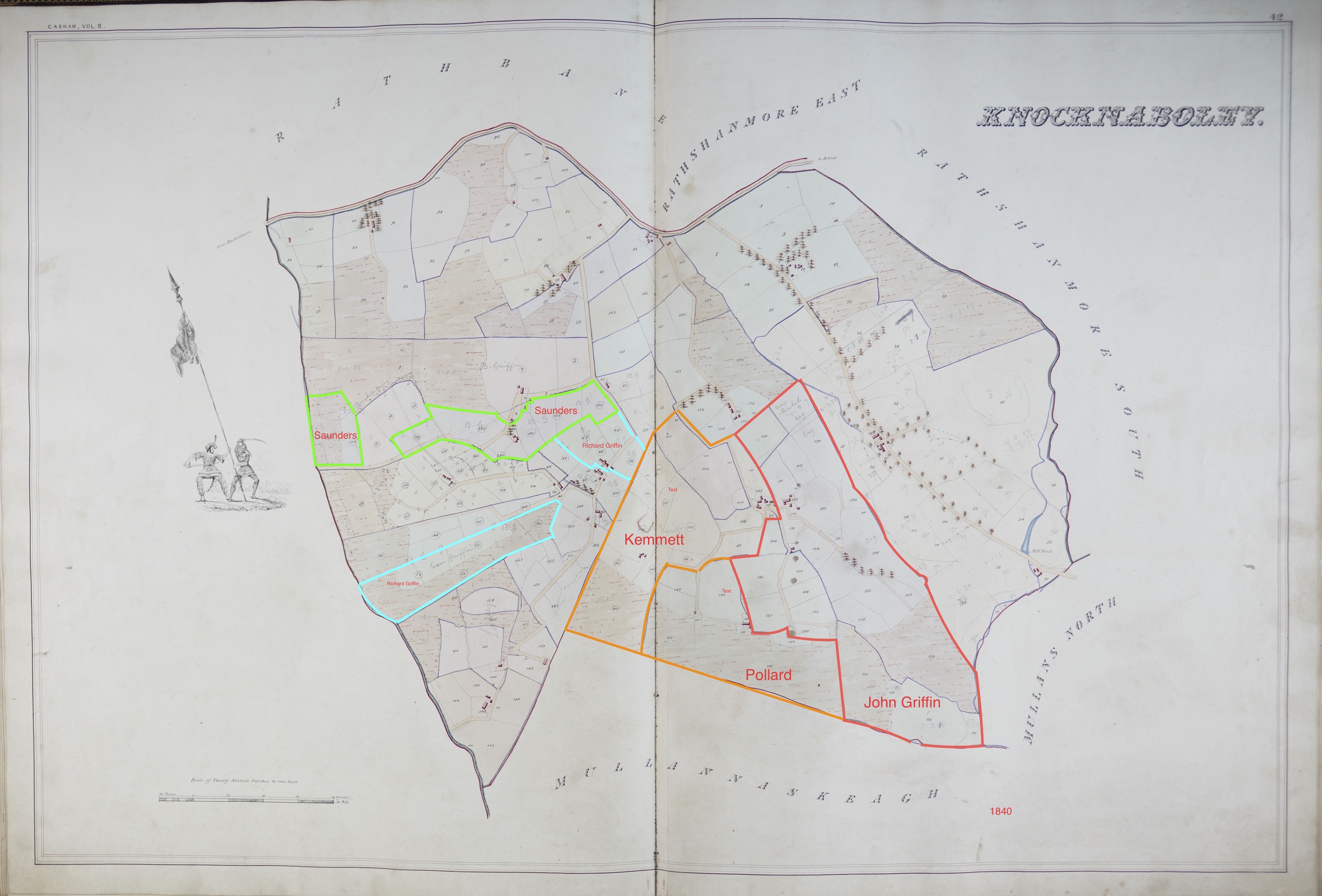 Property | Longterm lease on Coolatin Estate 1840 (Age 49 years)Shared note: A map from the Coolatin Estate shows that James Saunders and family lived on 14 acres on the west side of the townland of Knocknaboley on lots 176-183. The Griffith's House Books Records for Knocknaboley (FHL 2356199) show that James Saunders' house and land had been assumed by John Griffin of Knocknaboley. In the year 2000, 150 years later, the locals of Knocknaboley still knew that the Griffin property was formerly farmed by a Saunders family.