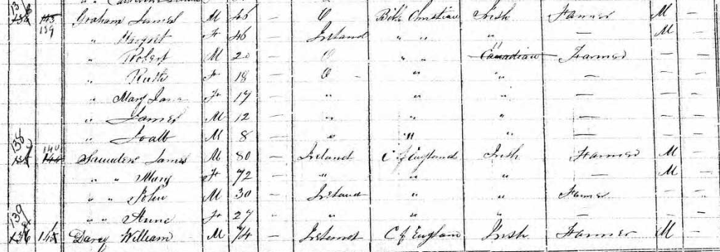 | Census | James Sanders Ireland ,Age 62, English Church Mary Sanders " 53 William Sanders " 16 John Sanders " 12 Thomas Sanders " 10 Living next to the Darcy families that came from Knocknaboley. |