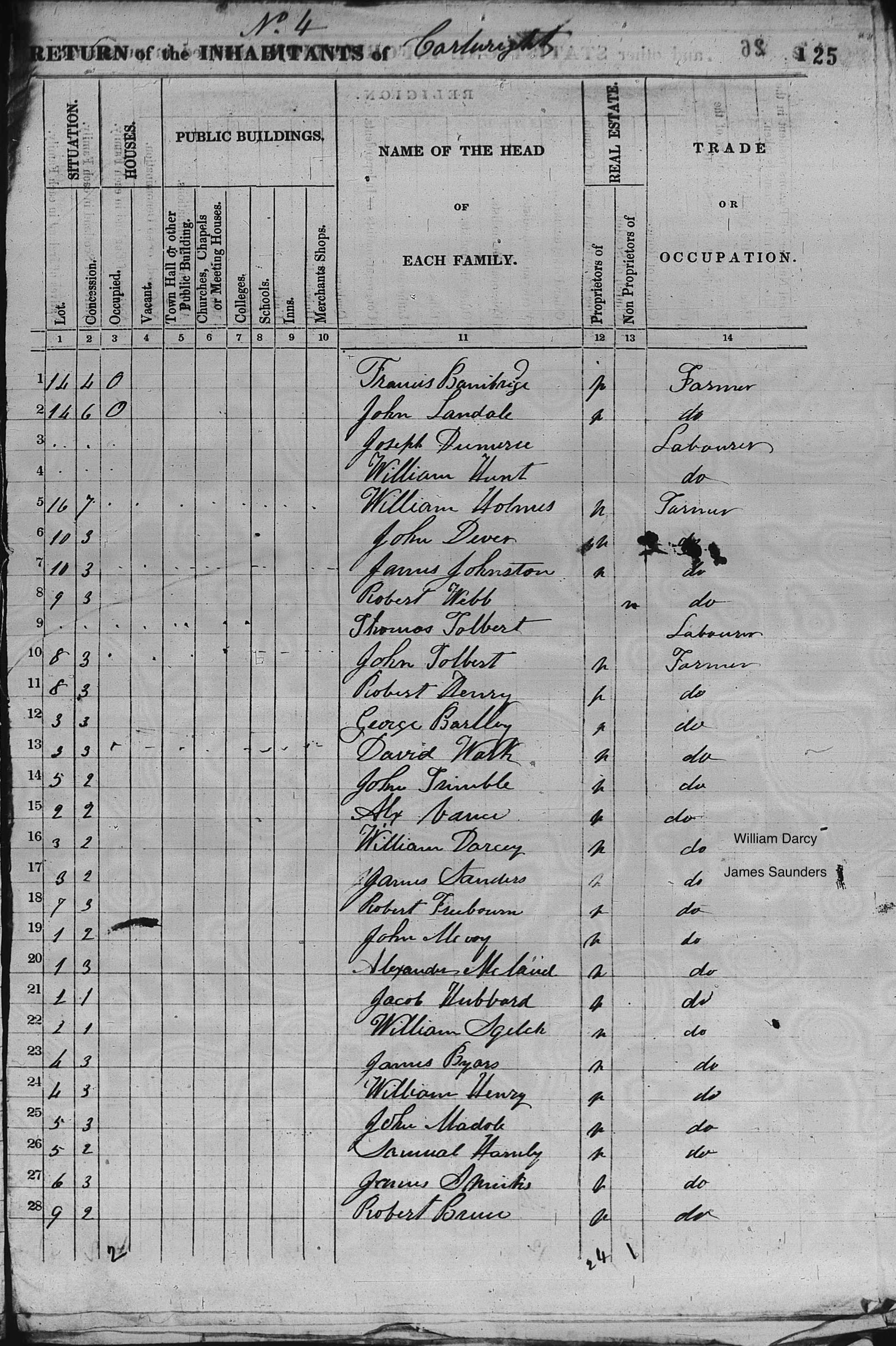 | Census | James Saunders and William Darcy were already in Cartwright Township by 1847, living side by side on Conc 2 Lot 3. Later the two split their ownership in two: Darcy took the west half and James Saunders took the East half of Conc 2 Lot 3 of Cartwright. (MCS 693, Reel 164, Ontario) |