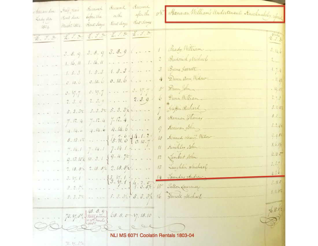Residence | 1800 Shared note: In the Rental List for the Coolatin estate, MS 6069 in the NLI, a footnote at the end of the book lists the undertenants of Mary Coates farm on Knocknaboley Wicklow. Andrew Saunders was one of the names on the list. The Coates had a major lease from the estate for at least 70 years which covered much of Knocknaboley townland. Many families worked for the Coates but their names would never appear in the Coolatin records, so it is fortunate to have this record. It shows that many of the future lessees of Knocknaboley were actually undertenants before they were granted leases in the 1805-1809 rewrites of leases. It is not clear how long Andrew had lived on the estate before 1800. By 1803 Mary Coates had died and William Hannan assumed part of her old lease on Knocknaboley. Another NLI manuscript MS 6071 contains a list of the 1803-04 undertenants of William Hannan in which Andrew Saunders is shown to farm about 4 Irish acres on Knocknaboley.