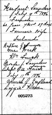 Death of a wife | Margaret TWAMLEY February 9, 1896 (Age 61 years) |