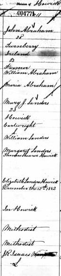 Marriage of a child | John ABRAHAM — Mary Jane SAUNDERS — View this family December 12, 1882 (Age 48 years) Shared note: The record clearly states that she is the daughter of William Saunders and she was born in Cartwright (Durham) Ontario.