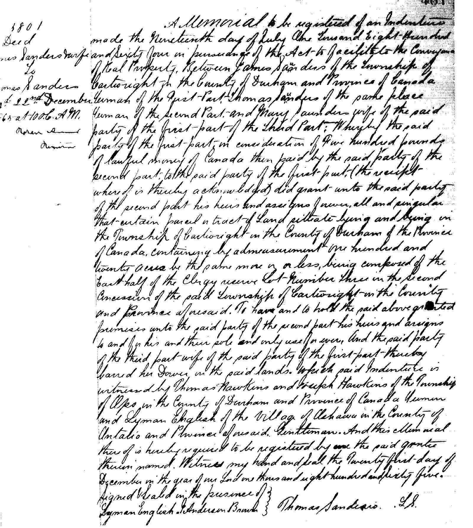 | Property | Thomas bought his father James' farm in Durham Co. |