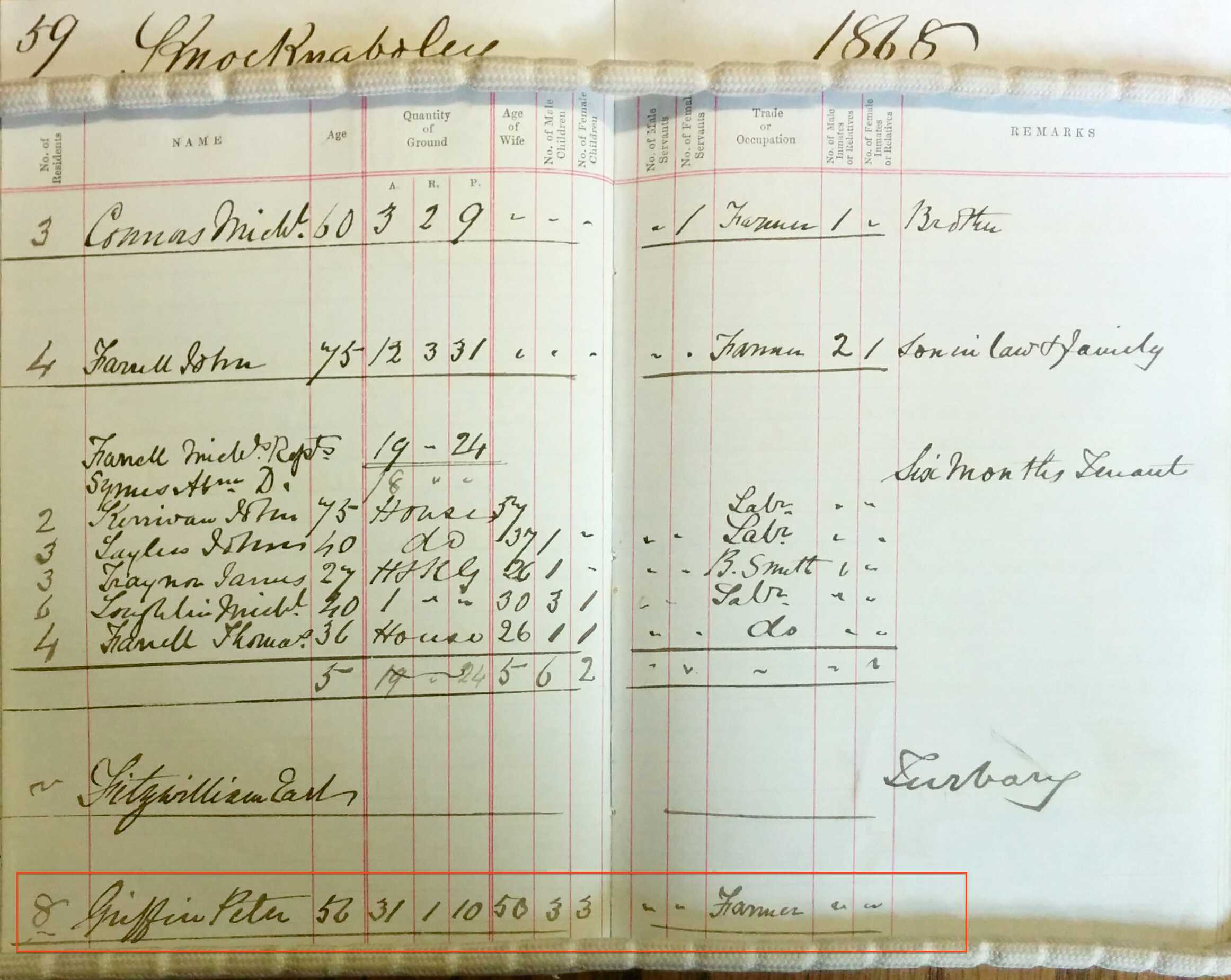| Residence | A residents census of 1868 gives family information for Peter Griffin. According to the data he was 56, his wife was 50, and they had 3 boys and 3 girls living with them. List of dog owners from Knocknaboley in 1866 names Peter Griffin and John Griffin. |
