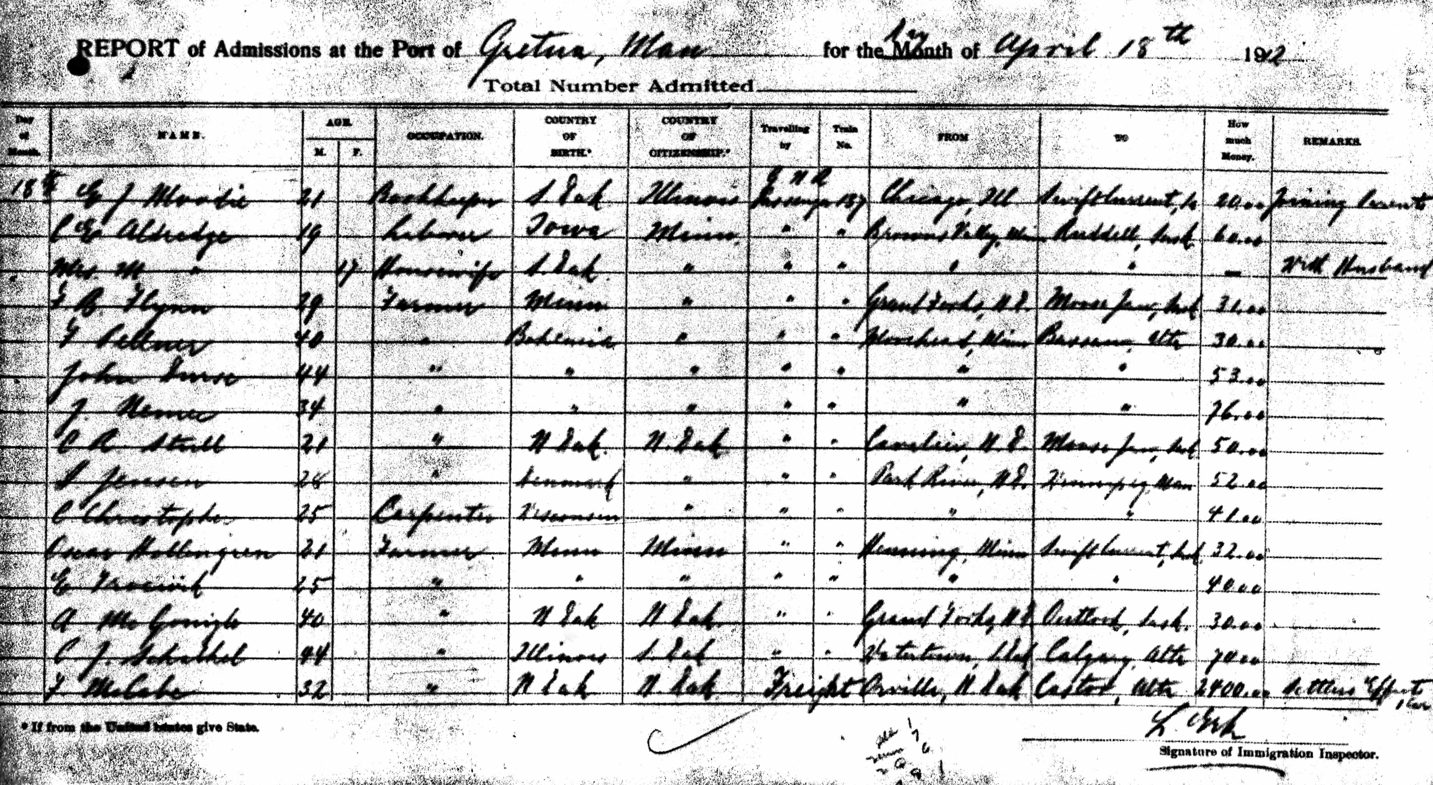 | Emigration | This record of border crossings at Gretna, Manitoba shows Frank McCabe (last entry on page) of Arvilla, ND crossing with Settlers Supplies on his way to Castor Alberta. The next page shows his brother A(rthur) McCabe and their friend Bud Geyer on the same train. The McCabe Brothers bought part several parcels of land near Castor, according to the CPR land Sales Records of the Glenbow Museum: