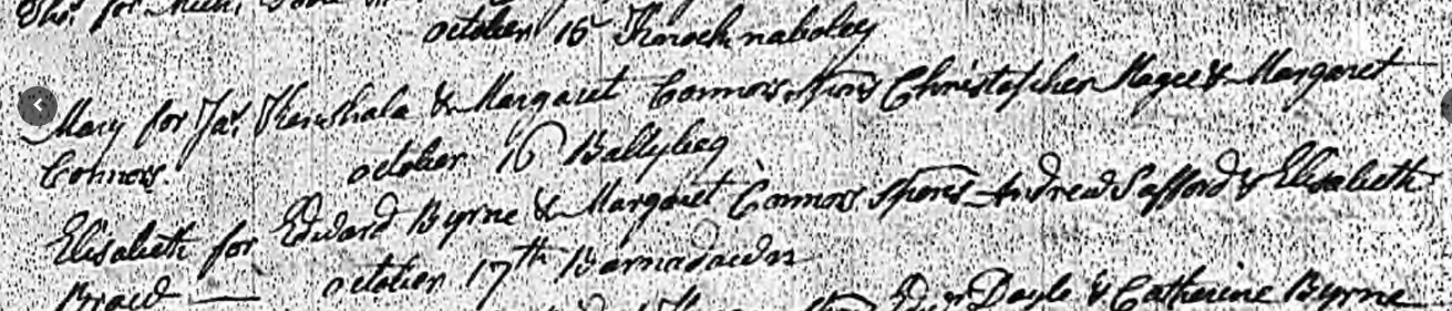 Birth of a child#1 | Mary? KENSHALA October 15, 1819 Shared note: Mary born to James Kenshala of Knocknaboley. The mother's name does not match Mary Saunders but there may have been a recording error. (Margaret Connor appears as mother on 2 records in a row.)