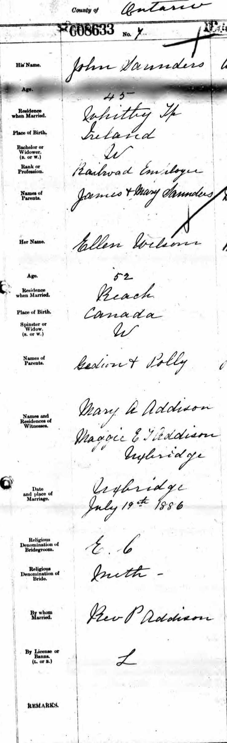| Shared note | Ontario, Canada, Marriages, 1801-1928 Name: John Saunders, Widower Birth Place: Ireland Age: 45 Father Name: James Saunders Mother Name: Mary Saunders Spouse Name: Ellen Wilson, Widow Spouse's Age: 52 Spouse Birth Place: Canada Spouse Father Name: Gedion Wilson Spouse Mother Name: Polly Wilson Marriage Date: 19 Jul 1886 Marriage County or District: Ontario |