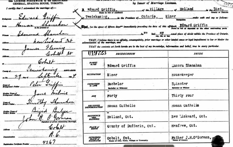 | Shared note | Ontario, Canada, Marriages Name: Edward Griffin Age: 40 Birth Place: County of Dufferin, Ont. Marriage Date: 29 Sep 1924 Marriage Location: Timiskaming District Marriage County or District: Timiskaming Father: Peter Griffin Mother: Jane Milnie Spouse: Hanora Shanahan Intended Abode: Cobalt Ont Spouse's Age: 34 Spouse Birth Place: Renfrew, Ont. Spouse Father: Timothy Shanahan Spouse Mother: Brigid Bulger Registration district: Temiskaming |