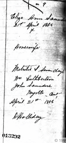 Marriage of a parent | John SAUNDERS — Ellen Wilson — View this family July 19, 1886 (Age 3 years) |