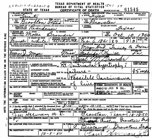Mary Angelina “Mollie” MAGEE Birth: February 6, 1861 21 23 Death: October 10, 1950 — Groveton, Trinity Co Tx |