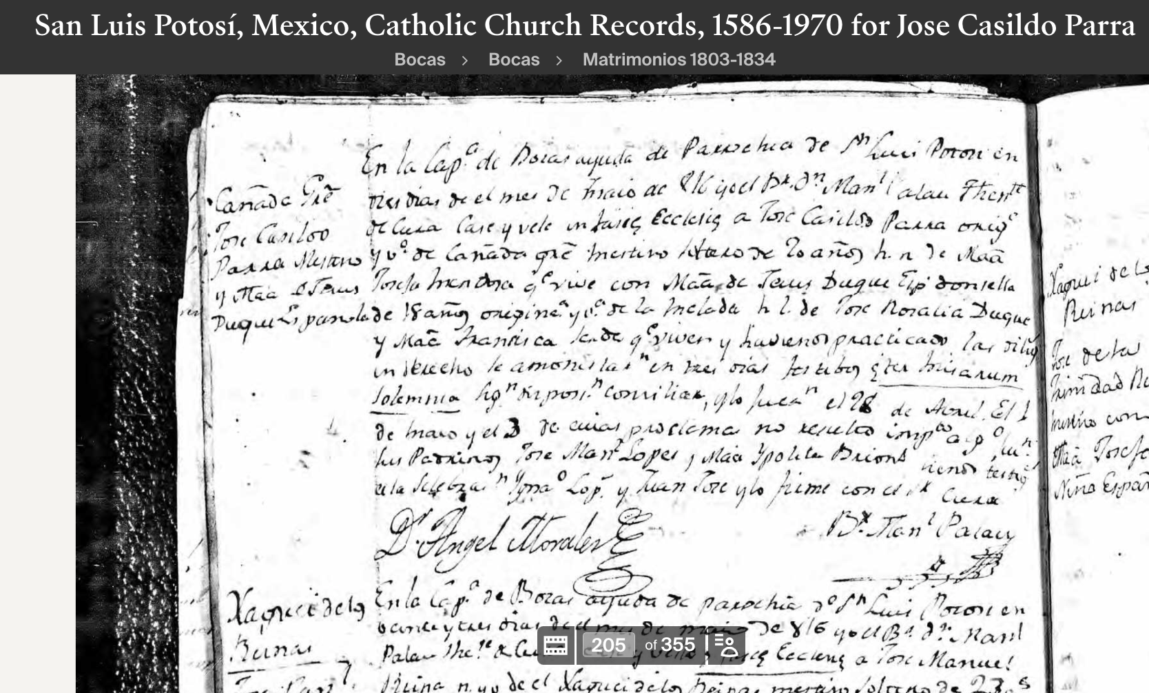 | Marriage | Mexico, Select Marriages Index, 1556-1989 Jose Casildo Parra Gender: Male Age: 20 Birth Date: 1795 Marriage Date: 10 may. 1815 (10 May 1815) Marriage Place: Bocas, San Luis Potosí, Mexico Mother: Maria Josefa Mendoza Spouse: Maria De Jesus Duque FHL Film Number: 640835 |
