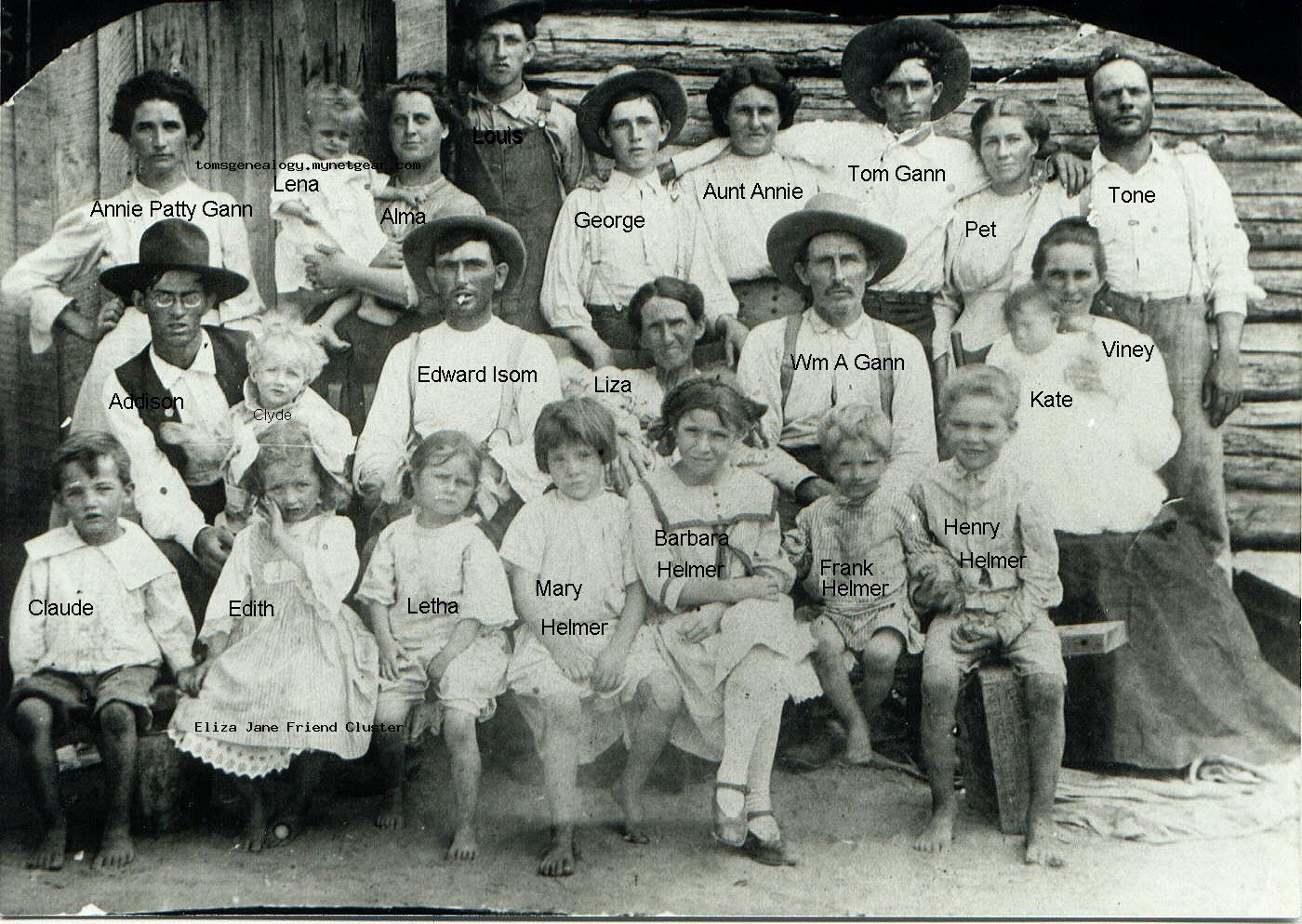 | Shared note | [silasdescendents.FTW] From William Charles Gann, Tulsa, OK. !Sometime during 1904, William Allen made a trip from his home in Dallas County, Mo., to the small settlement, Claremore, Indian Territory. Claremore was located on the San Francisco and St. Louis Railroad which ran from St. Louis, Missouri southwesterly to northeastern Oklahoma, through the Cherokee Nation and on to San Francisco. A post office had been established there on June 25, 1874. This settlement would later become the county seat of Rogers County when Oklahoma became a state in 1907. William Allen was the first to arrive in 1904. He was back and forth several times before the family finally came to stay. Oral family history records that sometime after 1904, William Allen became obsessed with the notion that he would not allow Eliza Jane, his wife, to become a registered Cherokee. He threatened to take them all back to Missouri before he would allow it. No one one in the family has been able to explain why William Allen felt as he did. It may have been because he had not been successful in obtaining Indian lands simply by walking in, without proof, and declaring himself to be married to a half-blood Cherokee. The proving process included such things as affidavits, sworn statements, witnesses, etc., something a simple farmer might have seen as "too much trouble." A man's "word" in the old West was a strong element in any "deal" and all this "proving-up" process was an indicator that his word was not good enough. The sixteenth bloods and lower would in most cases get no land at all. A forty-acre allotment of thin, rocky soil might have been too small for all the trouble. In the reasoning of William Allen, he simply denied the Cherokee Nation one of its own by not allowing Eliza Jane, his wife, to become registered. There may have been other reasons. Arrogance, meanness, and confidence have never been recessive traits in the Gann men. Whatever the circumstances, William Allen was described by all who knew him as a man of quick and violent temper. His memory was long when perceived injustices were thrust upon him by others. He was creative in his methods of "getting even." By 1908/09 William Allen and Eliza Jane would settle with their eight children one and one-half miles west of Coweta, Oklahoma. A farmer and obviously a man interested in land, he never acquired a square inch of Oklahoma soil. He became a "tenant farmer." There were two ways an individual could rent land for farming. One way was to give over one-third of the corn crop and one-fourth of the cotton at the end of the season. Another was to "cash rent." Both methods carried risk. Those who gave over crops at harvest time were the less fortunate and therefore had less status when farms became available for rent. The farmer who paid in crop yield at the end of the harvest was a "sharecropper." The protocol was to never refer to a "cash renter" as a "sharecropper" but as a tenant farmer. This pattern of farming was very prevalent in Oklahoma from 1910 up to the middle 1950's. William Allen would "cash rent" a farm and with the help of his sons, who were unmarried, make a living for his family. William Allen would "rent" a farm and his two youngest sons, George Washington and Louis, would plant and harvest the crops. The story is related of how William Allen treated his two youngest boys. When the crops were ready to harvest he would go to town early and wait for the boys to bring the corn to mill or the cotton to gin. He would collect the money for the crops and tell the boys to "get on back home and hire yourselves out to other farmers and earn your winter money." William Allen lived the balance of his life as a widower in the home of his youngest son, George Washington Gann. He died near the small Oklahoma town of Porter, located in southwestern Wagoner County. He is buried in the Shahan Cemetery just west of Coweta. His grave is unmarked and the cemetery records showing his burial place have been lost. The sandstone that marked his burial place has long since disappeared. On his death certificate his father is shown as Henry Gann, which must be William Henry. |