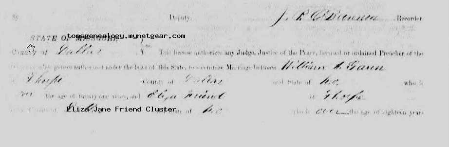 Marriage of a child | William Allen GANN — Eliza Jane FRIEND — View this family January 28, 1885 (Age 49 years) Note: License says both William and Eliza Jane were residents of Thorpe, Dallas Co, MO.