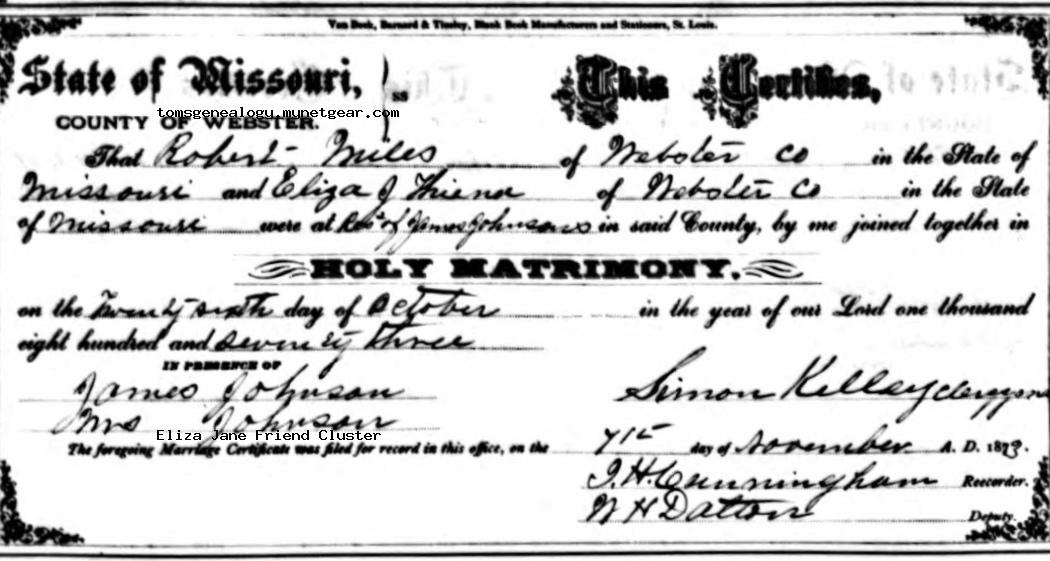 Marriage of a child | Robert MILES — Eliza Jane FRIEND — View this family Type: Religious marriage October 26, 1873 (Age 37 years)Address: James Johnson home in Webster Co. |