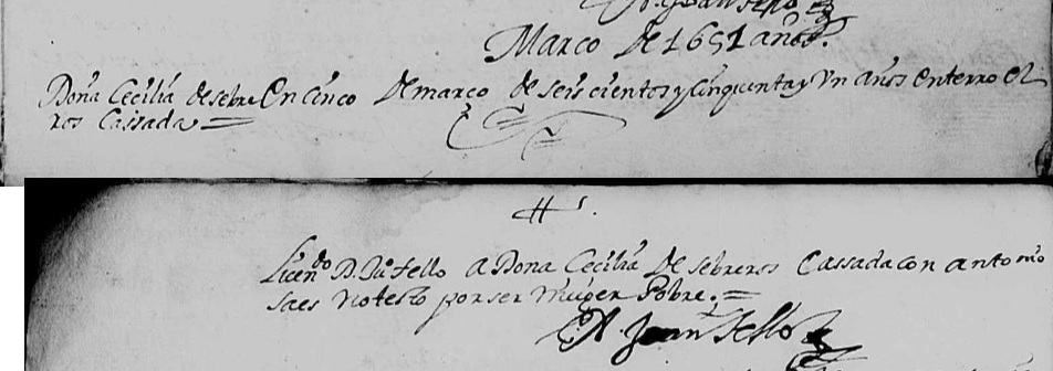 Burial of a wife | Cecilia de CEBREROS March 5, 1651 Note: Described as a poor woman, wife of Antonio Saes