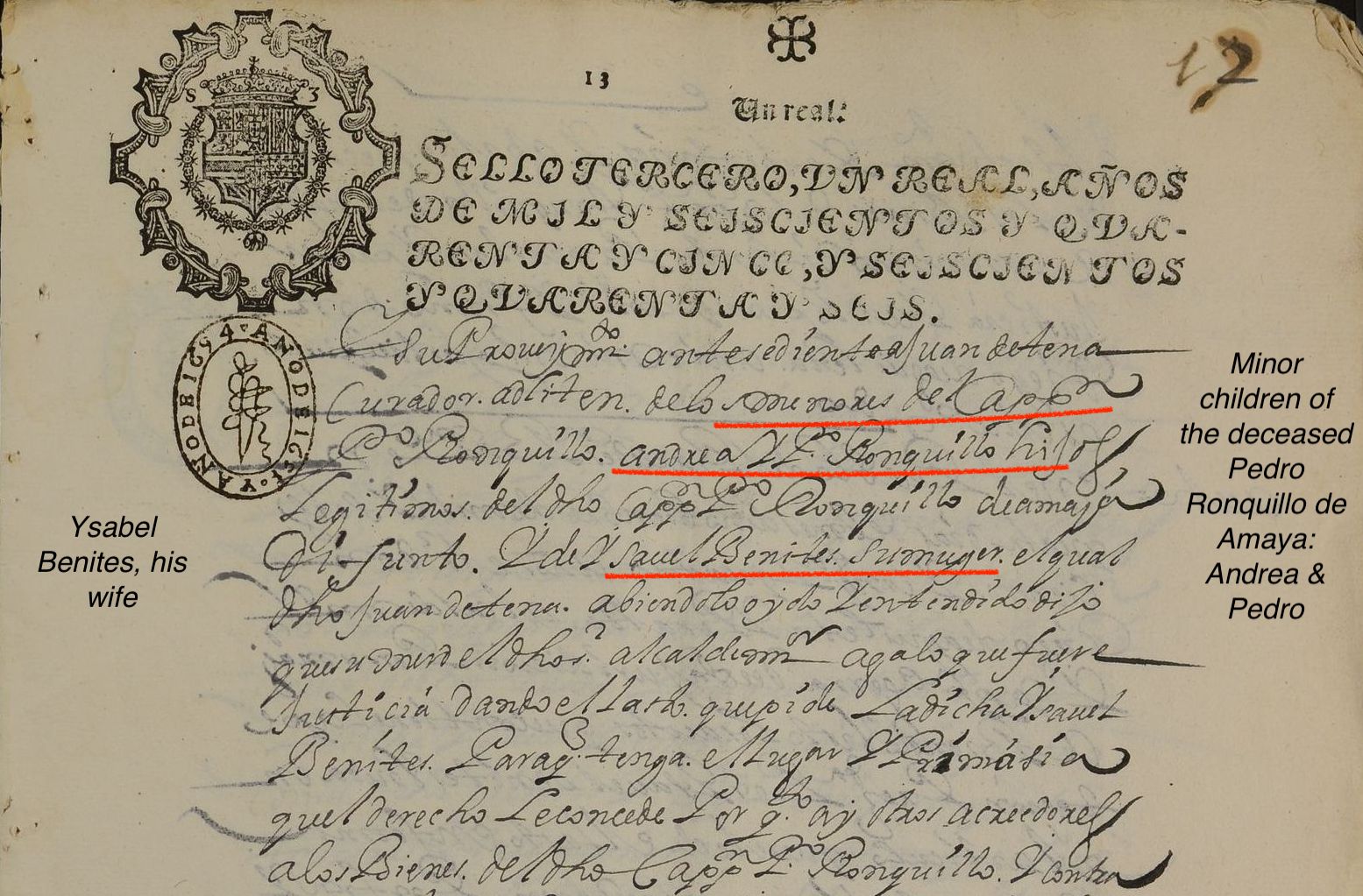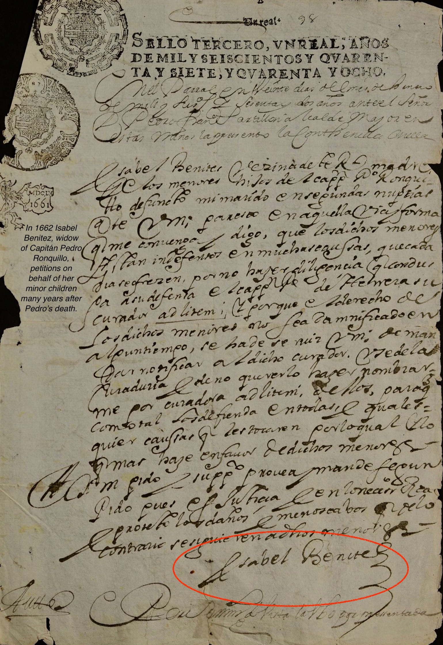 Probate | 1662 Note: The court case involving Isabel Benitez and the debtors of her husband Pedro Ronquillo lasted many ears after his death, as she tried to protect her estate and her minor children from the debtors.