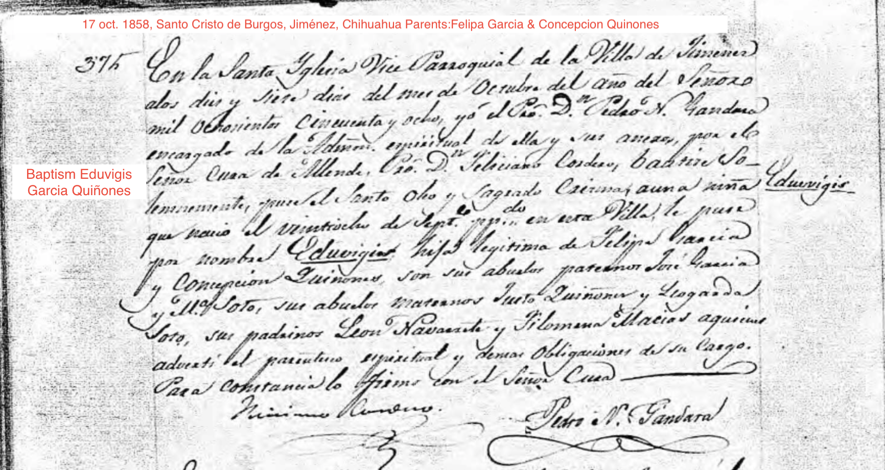 Maria Eduvigis GARCIA Baptism: October 17, 1858 33 28 — Santo Cristo de Burgos, Jimenez, Chihuahua, Mexico Death: March 14, 1951 — Los Angeles, CA |