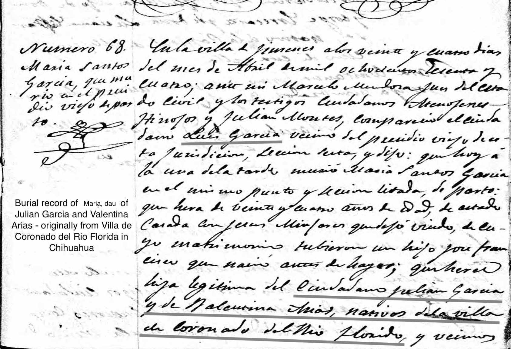 Maria de los Santos GARCIA ARIAS Baptism: November 3, 1839 — Santo Cristo de Burgos, Jiménez, Chihuahua, Mexico Death: April 24, 1864 — Jimenez, Chihuahua, Mexico |
