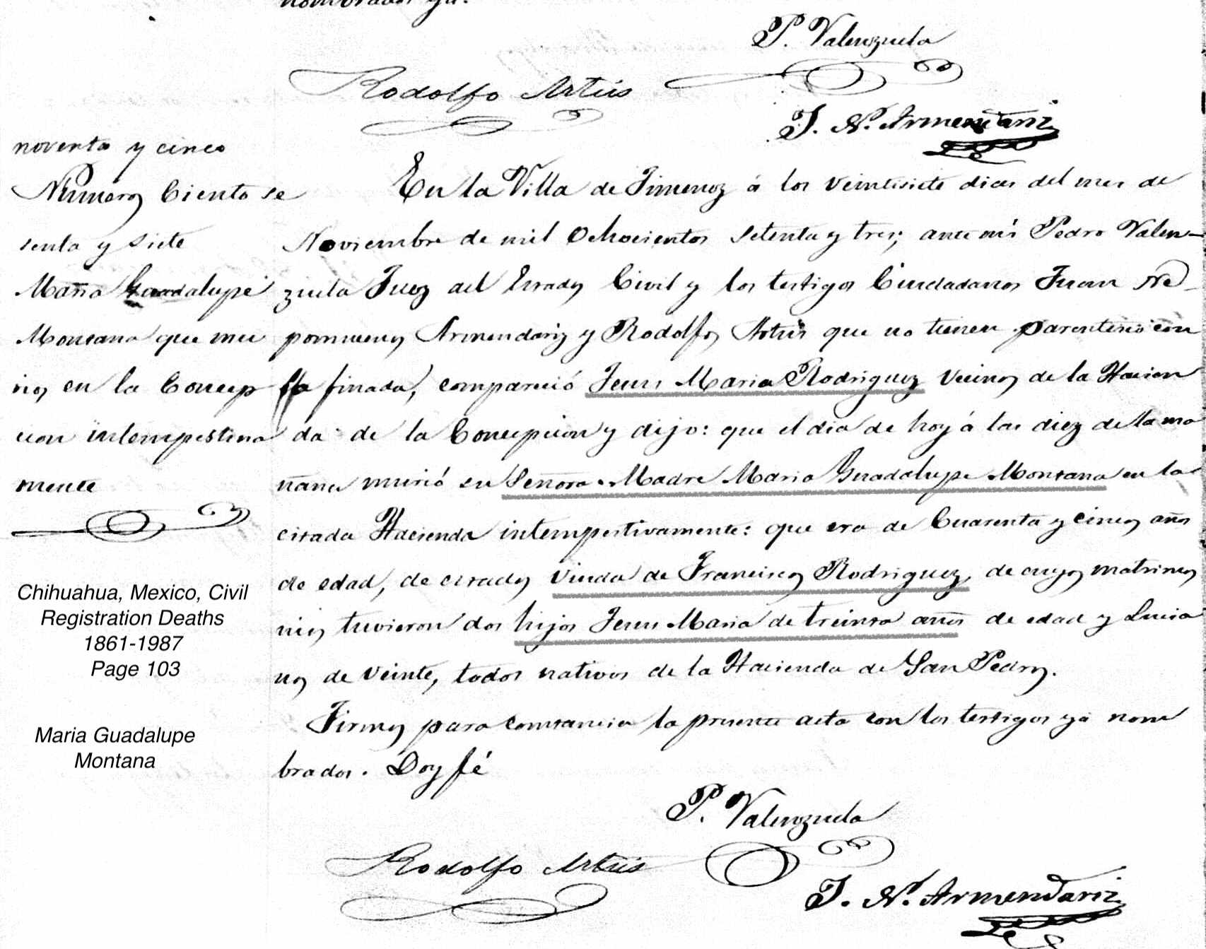 Death of a paternal grandmother | Maria Guadalupe MONTANA November 27, 1873 (Age 6 years) Age: 45 Address: Hacienda de la Concepcion |