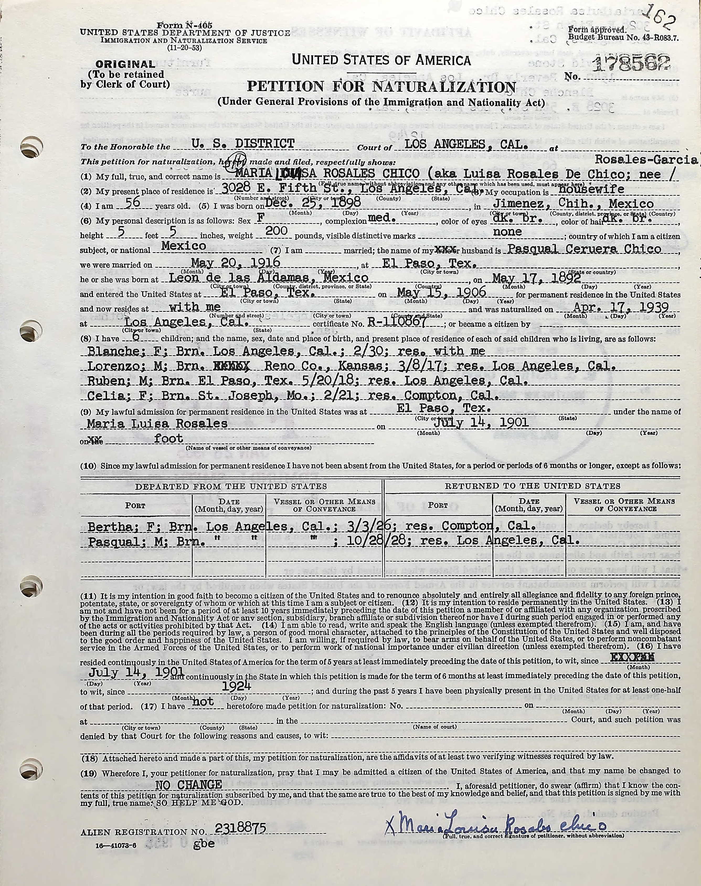 | Naturalization | California, Federal Naturalization Records, 1843-1999 For Maria Louisa Rosales Chico [Luisa Rosales Rosales Maria De Chico Garcia] Petition Age: 56 Record Type: Petition Birth Date: 25 Dec 1898 Birth Place: Jimenez, Chih., Mexico Arrival date: 14 Jul 1901 Arrival Place: El Paso, Tex Petition Date: 28 Jan 1955 Petition Place: Los Angeles, California, USA Spouse: Pasqual Ceruera Chico |