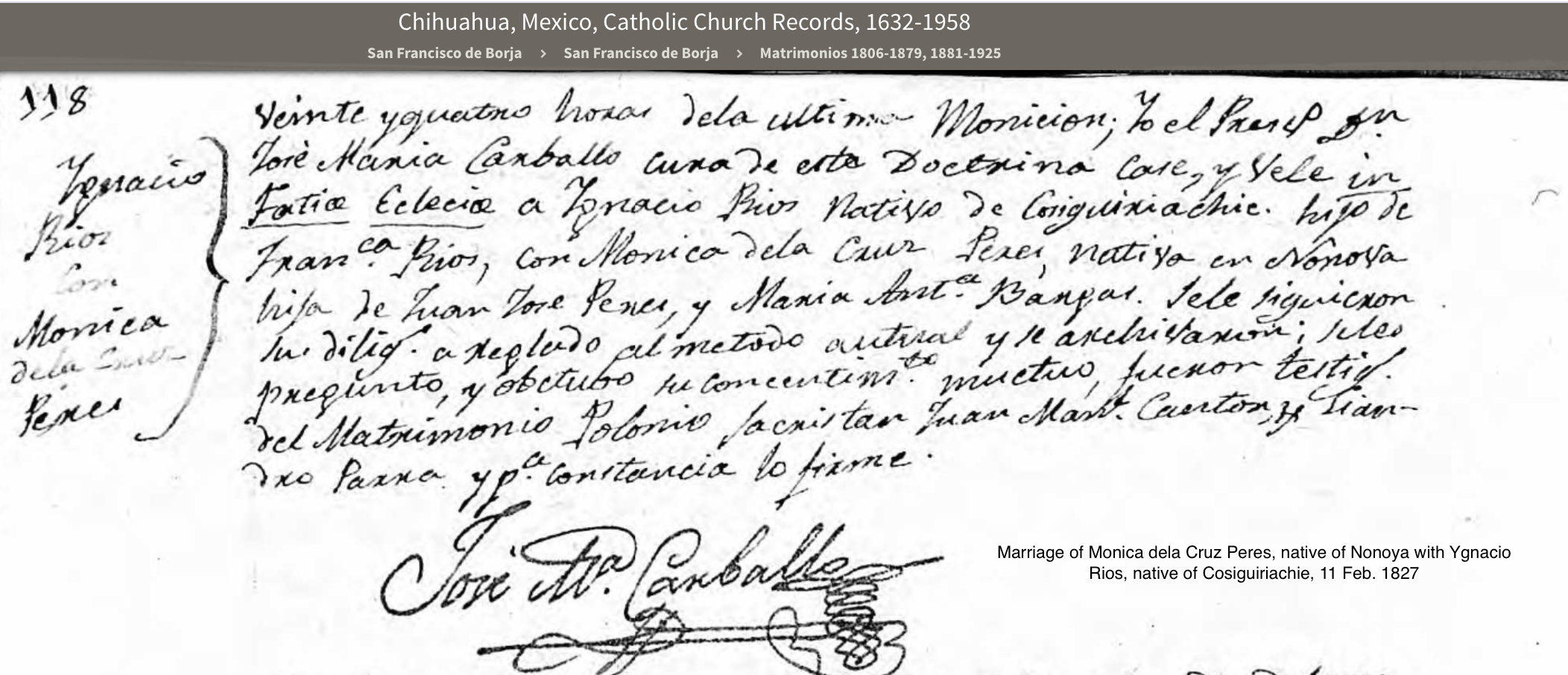 | Marriage | Chihuahua, Mexico, Catholic Church Records, 1632-1958 For Monica dela Cruz Peres Gender: Mujer (Female) Record Type: matrimonio (Marriage) Marriage Date: 11 feb. 1827 Marriage Place: San Francisco de Borja, San Francisco de Borja, Chihuahua, Mexico Father: Juan Jose Peres Mother: Maria Anta. Bargas Spouse: Ignacio Rios Page Number: 117 |