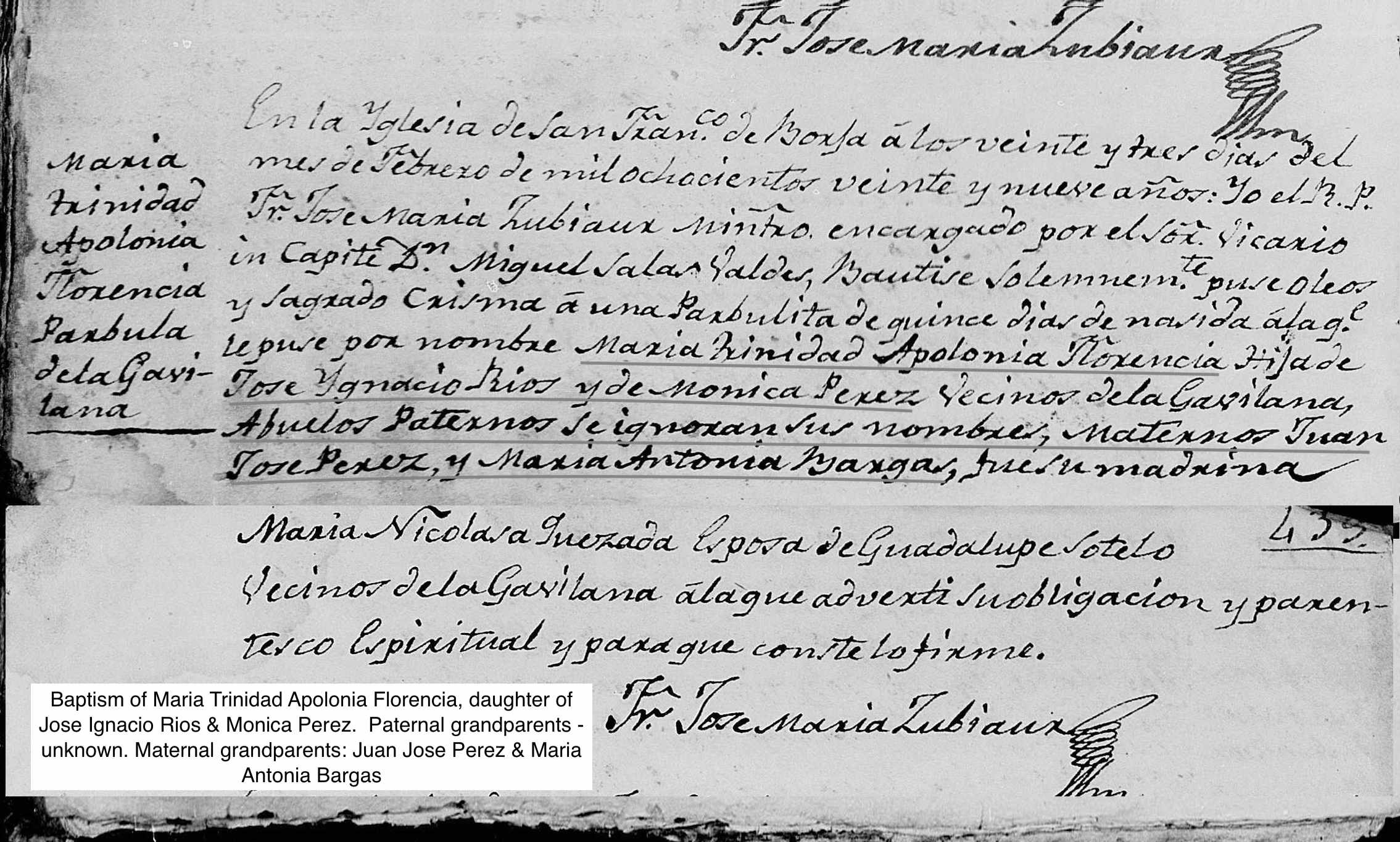 Maria Trinidad Apolonia Florencia RIOS PEREZ Baptism: February 23, 1829 22 — San Francisco de Borja, San Francisco de Borja, Chihuahua, Mexico |