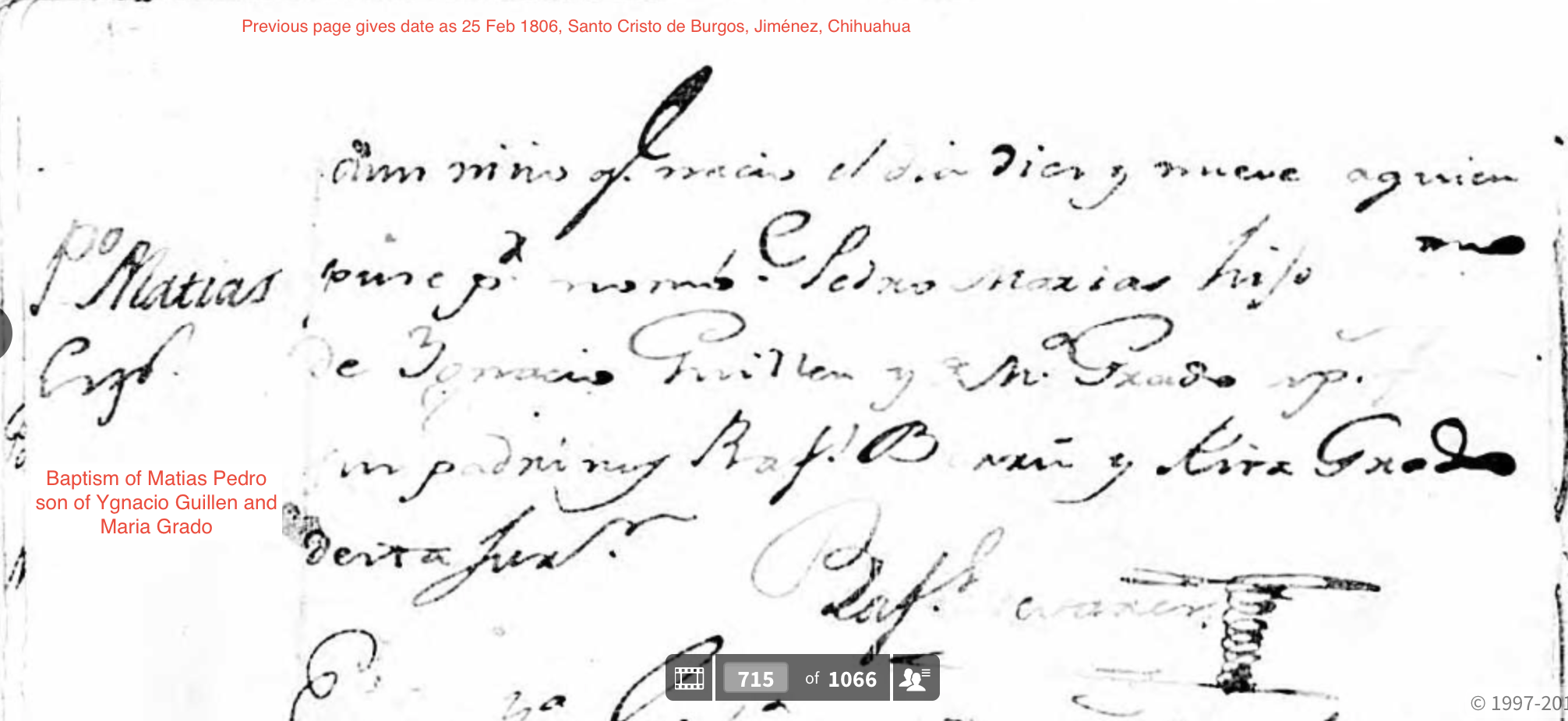 Matias GUILLEN Baptism: February 25, 1806 31 22 — Santo Cristo de Burgos, Jimenez, Chihuahua, Mexico |