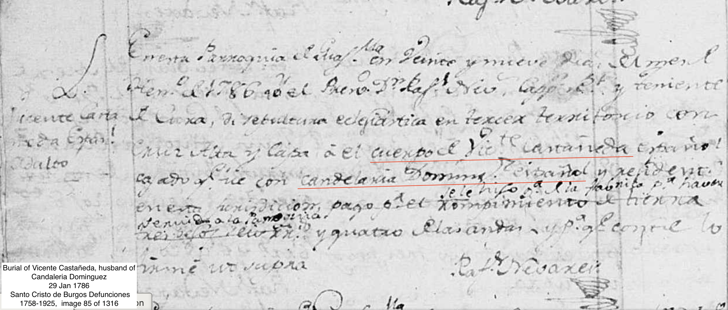 Vicente Francisco CASTAÑEDA Birth: about 1727 Burial: January 29, 1786 — Santo Cristo de Burgos, Jimenez, Chihuahua, Mexico |