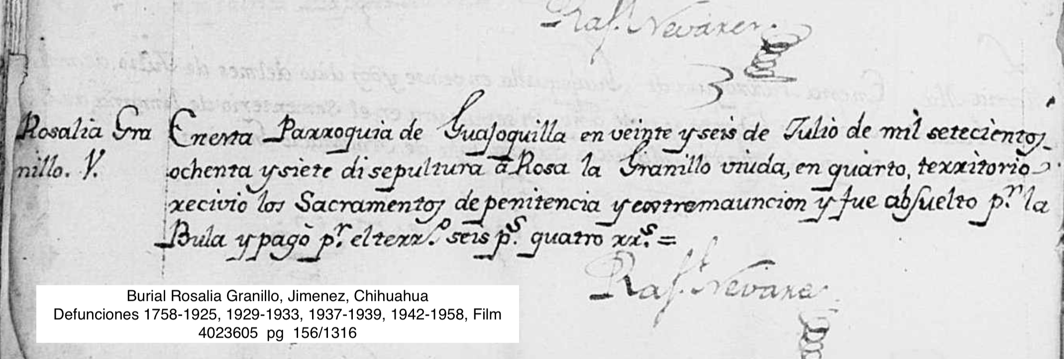 Rosalia Guillema GRANILLO Baptism: February 26, 1716 — Valle de San Bartolome, Chihuahua, Nueva Vizcaya Burial: July 26, 1787 — Guajoquilla (Jimenez, Chihuahuua) |