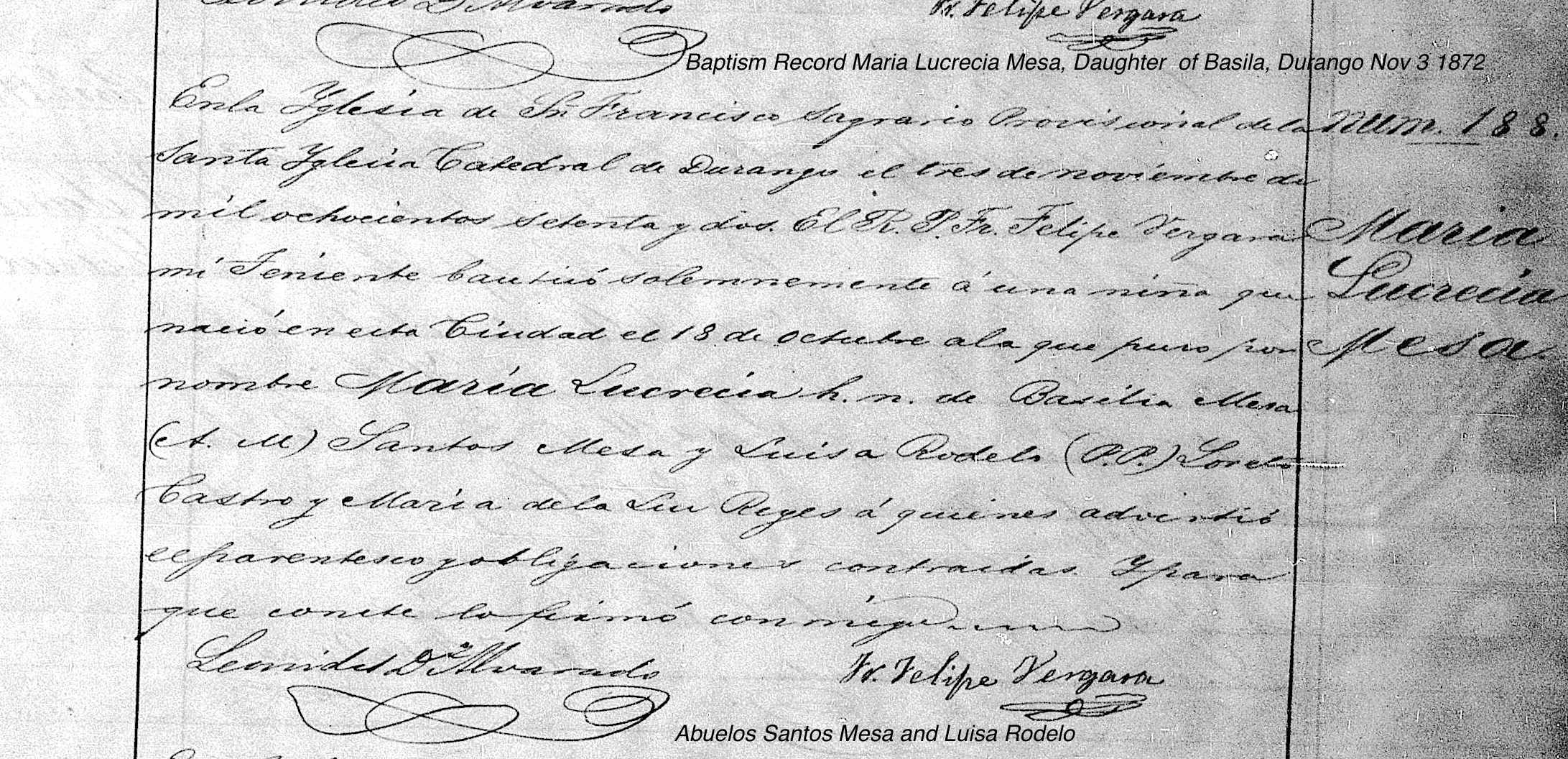 Maria Lucrecia MESA Baptism: November 3, 1872 31 31 — EL SAGRARIO METROPOLITANO, VICTORIA DE DURANGO, DURANGO, MEXICO Death: July 21, 1875 — Durango, Durango, Mexico |