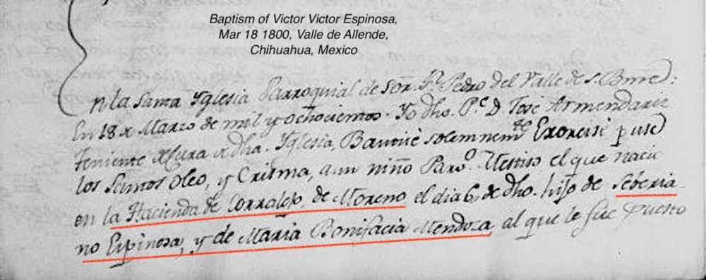 Jose Victor Gabriel ESPINOSA Baptism: March 18, 1800 38 39 — San Bartolome, Valle De Allende, Chihuahua, Mexico |