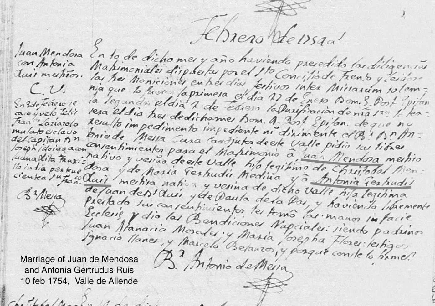| Marriage | Mexico Marriages, 1570-1950 For Juan Mendosa 10 Feb 1754 San Bartolome, Valle de Allende, Chihuahua, Mexico Spouse's Name: Antonia Gertrudis Ruis Parents: Cristobal Mendosa & Maria Gertrudis Medina and Juan de Ruis & Paula de la Paz |