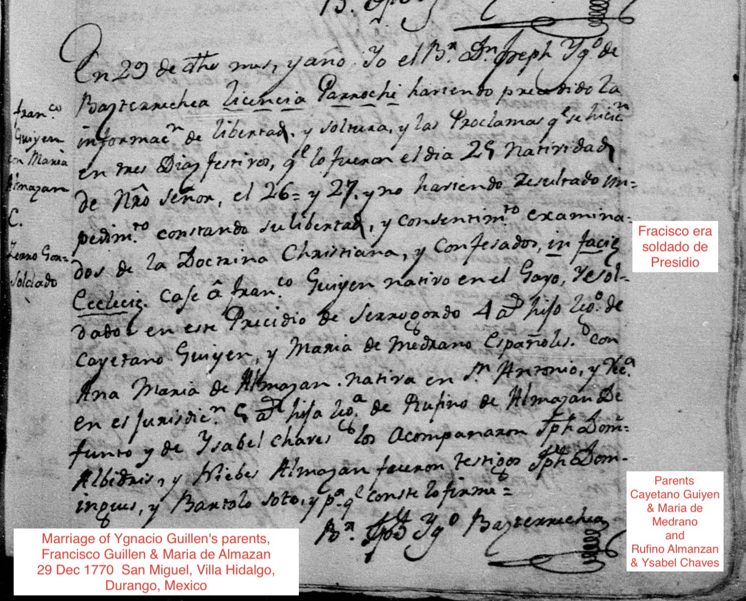 | Marriage | Mexico, Select Marriages Index, 1556-1989 For Rufino De Almazan Gender: Male Marriage Date: 11 oct. 1743 Marriage Place: San Jose,Hidalgo Del Parral,Chihuahua,Mexico Father: Miguel Feliz De Almazan Mother: Juana De Rivas Spouse: Ysabel Antonia De Chaves Her Parents: Father: Francisco Xavier De Chaves Mother: Francisca Manriquez FHL Film Number: 162555 |