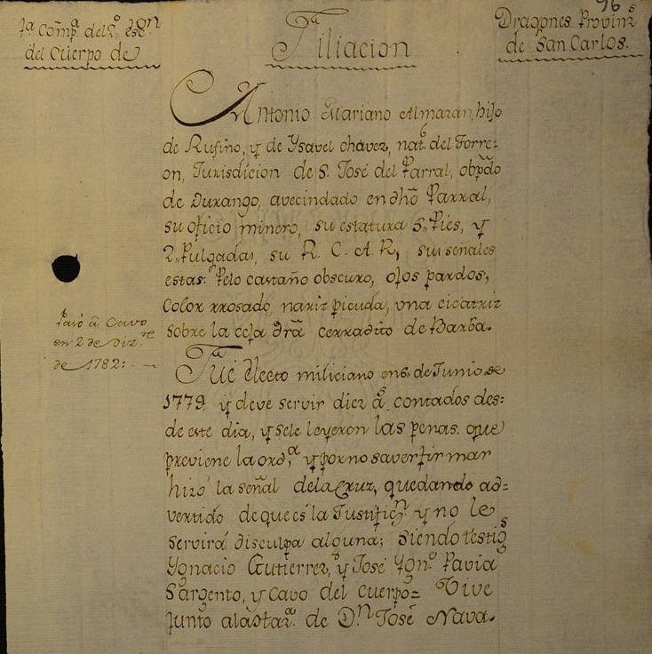 | Military | Format: image/jpeg Image dimensions: 724 × 1,055 pixels File size: 220 KB Type: Document Note: In 1781 there were 3 family members in the 1st Co, 2nd Squadron of the San Carlos Dragoons. Anselmo Almasan and Antonio Almasan were sons of Rufino Almasan & Ysabel de Chavez. Don Prudencio Chaves was Ysabel's brother, and son of Francisco Xavier de Chavez of Nuevas Minas.