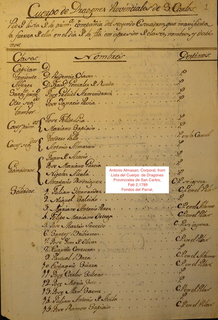 Corporal Antonio Almasan on 1789 Roster of Provincial Dragoons of San Carlos Note: Antonio Almasan was promoted to corporal in 1782. Here he is listed as part of the unit of Lt Prudencio Chaves (who might be the son of Francisco Xavier Chaves, his sister Ysabel's brother in law.)