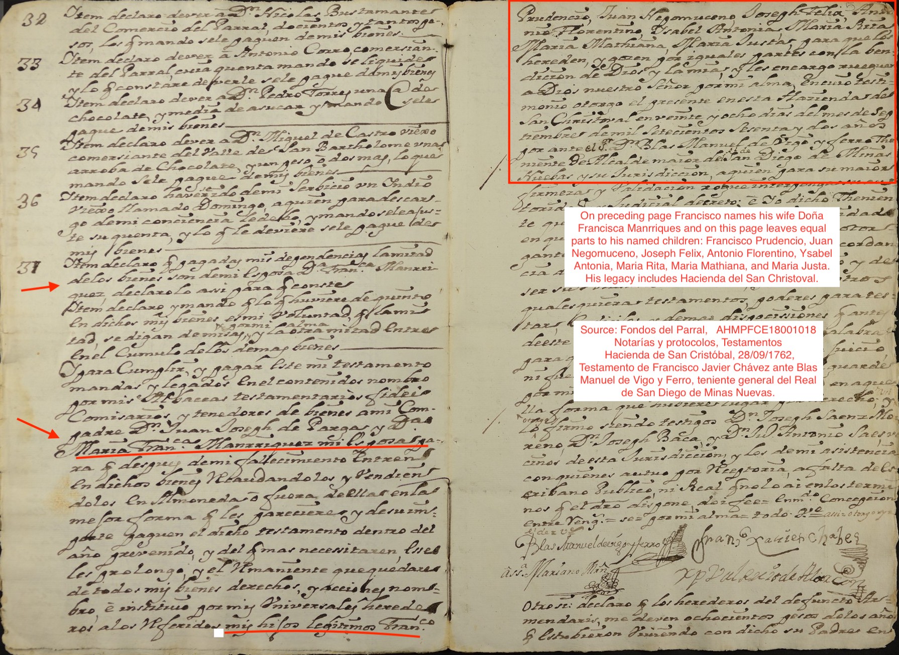 Death of a maternal grandfather | Francisco Xavier de CHAVES 1764 (Age 21 years) Note: The following record indicates Francisco died in 1762 but other documents in Parral having his signa… |