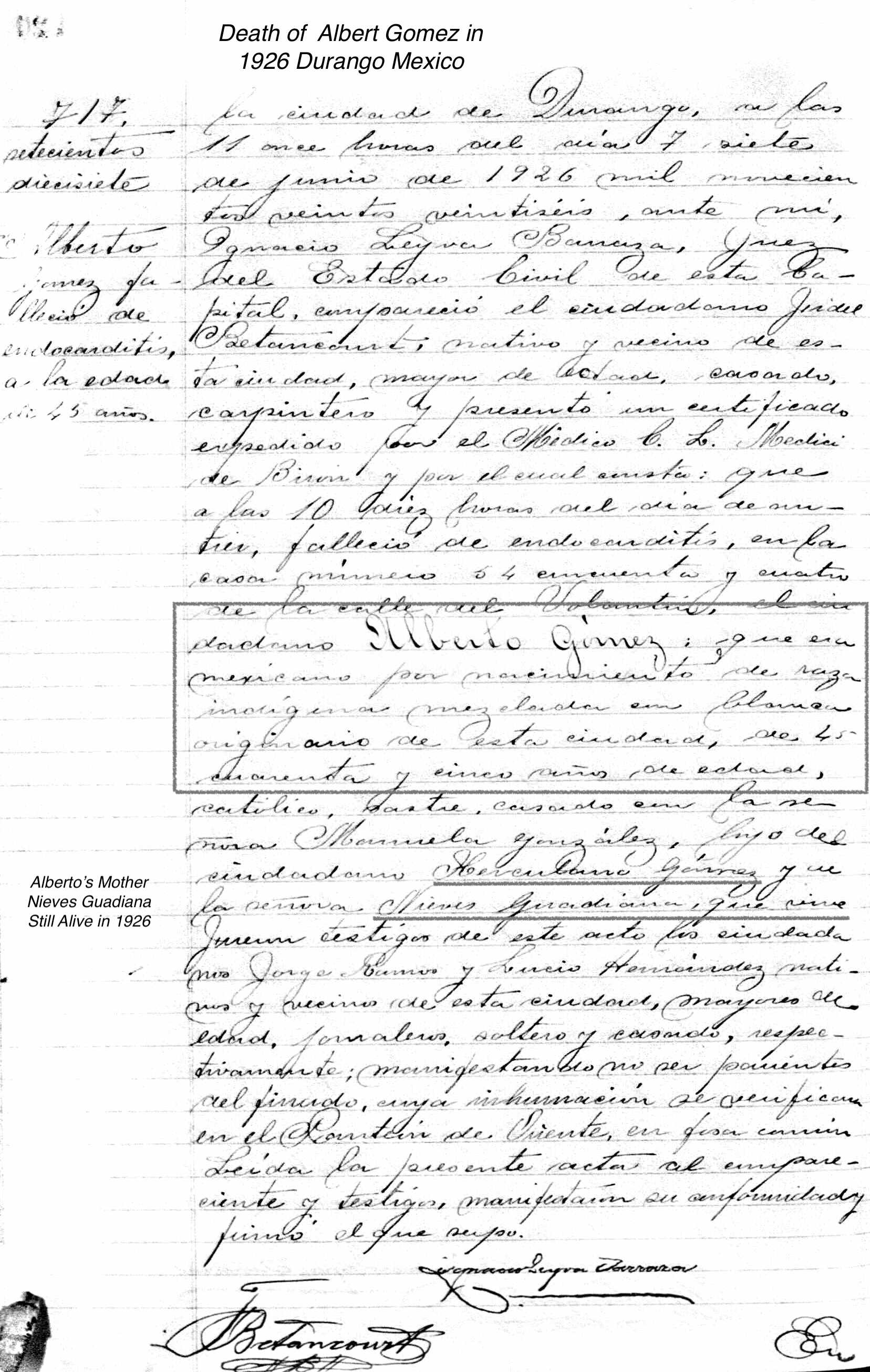 | Death | Durango, Mexico, Civil Registration Deaths, 1861-1987 For Alberto Gómez Gender: Hombre (Male) Age: 45 Birth Year: abt 1881 Death Registration Date: 7 jun. 1926 Death Registration Place: Durango, Durango, México (Mexico) Spouse: Manuela González Father: Herculano Gómez Mother: Nieves Guadiana His death record states that Gomez "was Mexican born of mixed indigenous and white races." |