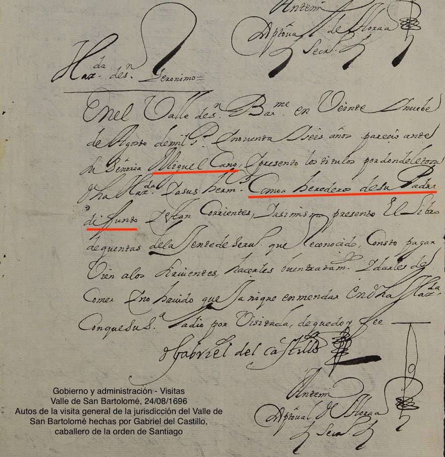 | Property | Miguel Cano held the Hacienda San Geronimo in 1696 as part of his father Diego Cano's estate. |
