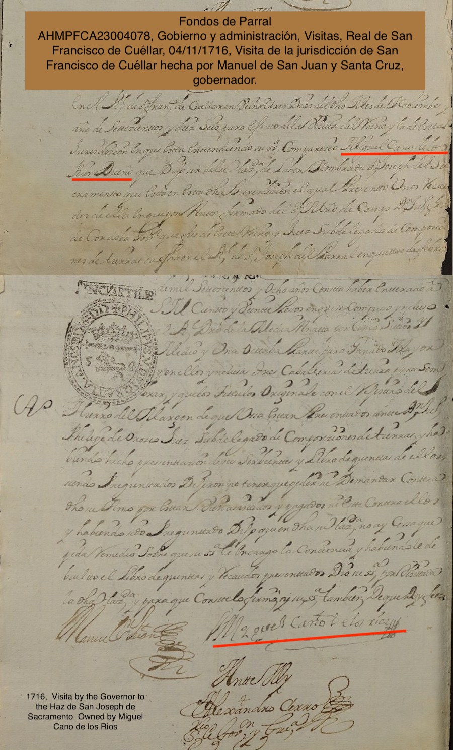 | Property | Miguel Cano de los Rios was mentioned in this document from 1723. Miguel was executor of part of the estate of his brother Blas; in 1723 Blas Cano's children demanded that Miguel release the Hacienda's owned by Blas to themselves. From the book DEL CHIHUAHUA COLONIAL. LA PROPIEDAD DE LA TIERRA, pg 163 Gracias a un litigio y a una venta de tierras nos enteramos ahora de que la Hacienda de San José del Sacramento, en cuyas demasías fue fundada nuestra ciudad actual, perteneció a la familia Cano de los Ríos. Esta escritura data de noviembre de 1723 y pasa ante el mismo escribano. Comparece don Antonio Cano de los Ríos, como hijo y unode los herederos del capitán Blas Cano y de Doña Ignacia Terrazas de Valenzuela. Dice que al morir su padre se inventariaron sus bienes y que éstos los recibió don Miguel Cano de los Ríos, su tío, como albacea y curador de los hijos menores del capitán Blas Cano. Se queja de que ya han pasado 13 años de la muerte de este capitán y los bienes mencionados no se han repartido entre los herederos, y por esto le tiene puesto pleito. Sigue la escritura y más delante dice el mencionado Antonio Cano de los Ríos que ahora ya se han puesto de acuerdo los herederos con su tío y que han decidido vender la hacienda. La van a vender a don Juan de Zubía Pacheco y la parte que le corresponde a don Antonio Cano de los Ríos se va a tratar en 1,032 pesos de oro. Otro dato de interés para la vida de nuestra ciudad es que esa Hacienda de San José del Sacramento se dice que lindaba con tierras de los indios de la Misión de Nombre de Dios y que contaba con tierras de labor, un molino y casas de habitación. (Translation) Thanks to litigation and a sale of land, we now learn that the Hacienda of San José del Sacramento, on which our current city was founded, belonged to the Cano de los Ríos family. This writing dates from November 1723 and passes before the same clerk. Don Antonio Cano de los Ríos appears as son and one of the heirs of Captain Blas Cano and Mrs. Ignacia Terrazas de Valenzuela. He says that when his father died his assets were inventoried and that they were received by Miguel Cano de los Ríos, his uncle, as executor and curator of the minor children of Captain Blas Cano. He complains that 13 years have passed since the death of this captain and the aforementioned assets have not been distributed among the heirs, and that is why he has a lawsuit. Further ahead the aforementioned Antonio Cano de los Ríos says that now the heirs have agreed with their uncle and that they have decided to sell the hacienda. They are going to sell it to Don Juan de Zubía Pacheco and the part that corresponds to Don Antonio Cano de los Ríos is going to be 1,032 pesos of gold. Another fact of interest for the life of our city is that the Treasury of San José del Sacramento is said to border the lands of the Indians of the Mission of Nombre de Dios and that it had farmland, a mill and houses. |